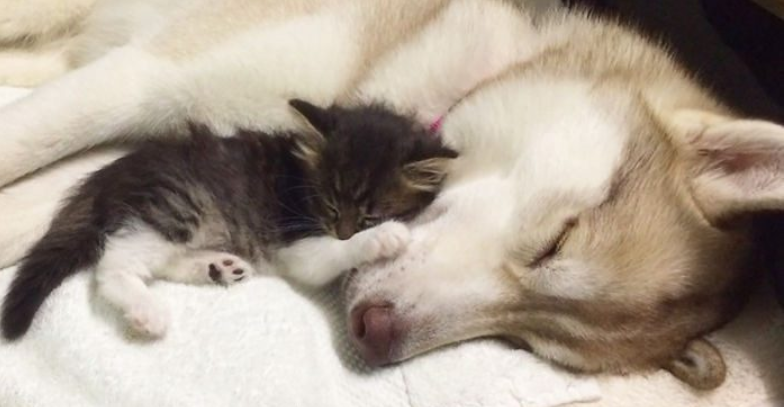 Их можно было увидеть в парке: величавая светло-серая хаски и маленький котёнок, семенящий рядом, полностью копируя походку своей мамы.