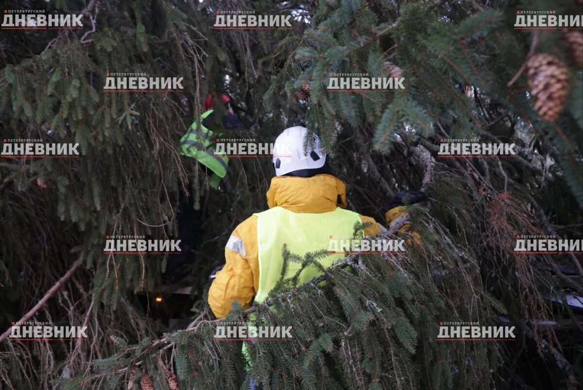 Десять утра. Движение по Вещевскому шоссе (Выборгский район Ленобласти) перекрыто. Вдоль дороги выстраивается спецтехника, рабочие в ярких жилетках осматривают территорию и еще раз сверяются с расчетами. На величественной 33-метровой ели переливаются солнечные лучи, а ветви дерева пушисты от мороза – минус 9 градусов. Срубили за 10 минут Трудится целая команда профессионалов – альпинист взбирается к самой макушке дерева, а крановщик поднимает ему стропы на желтой стреле. В 10:50 у подножья человек с бензопилой приступает к своей работе – и щепки начинают лететь во все стороны! К 11:00 процедура завершается. «Елку, конечно, мы выбирали заранее, можно сказать, еще в летний период. Примерялись несколько раз и, по-моему, не ошиблись с выбором, – говорит директор Городского центра рекламы и праздничного оформления Андрей Чистяков. – Параметры елки из года в год не меняются. Основные характеристики – она должна быть прямая и, конечно, пышная. Эта ель самая пышная из всех!» Пышных елок в леса