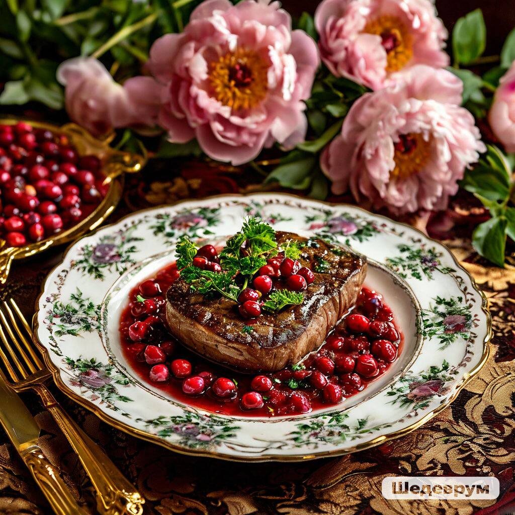 Когда стейк готов и готов к подаче, мы кладем его на тарелку, аккуратно поливаем сверху ароматным брусничным соусом, который не только добавляет прекрасный вкус, но и придает яркий цвет и аппетитный вид. Соус можно немного прогреть перед подачей, чтобы он был теплее и раскрывал все свои ароматы, или оставить его свежим — все зависит от вашего предпочтения.