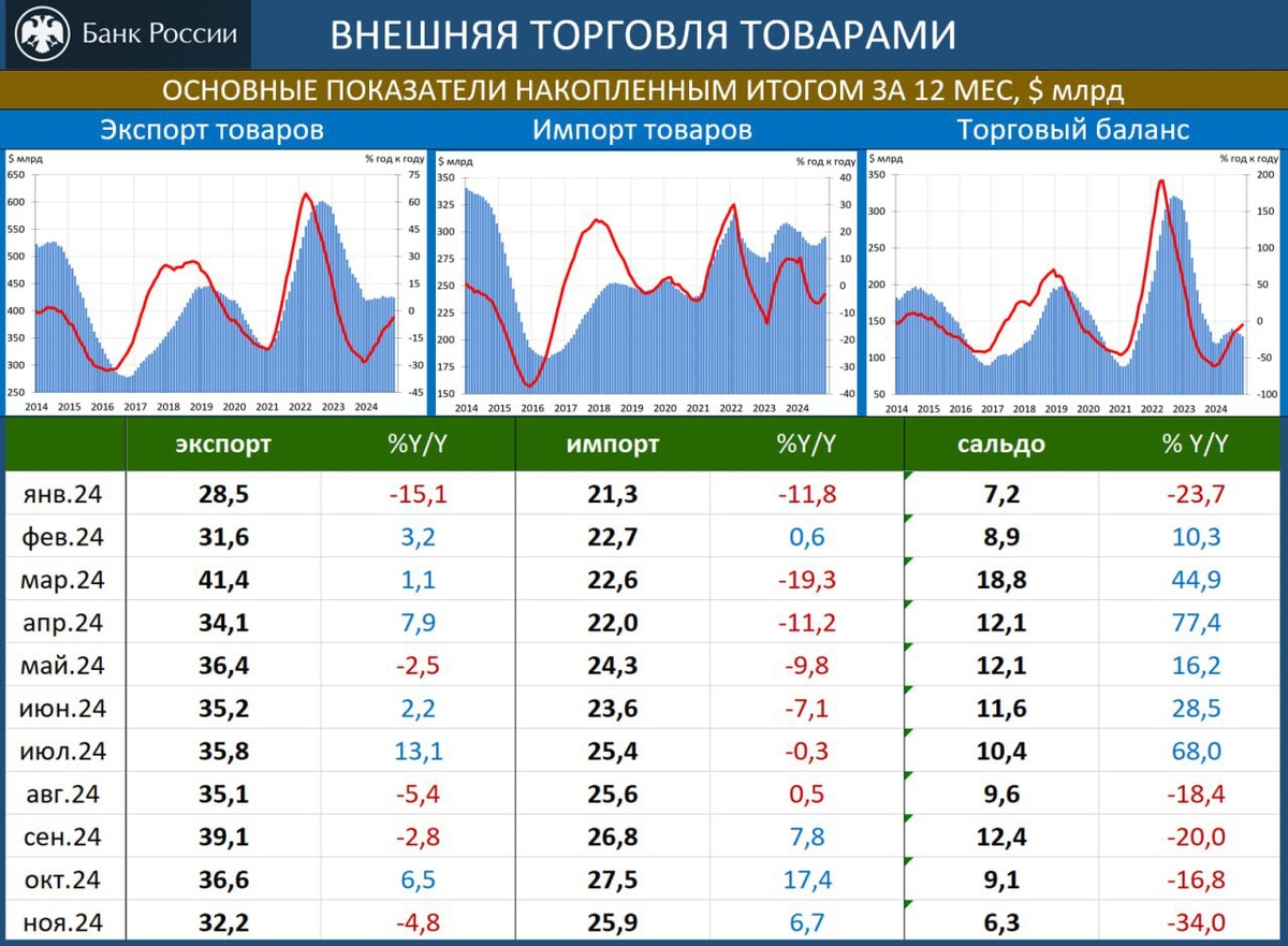 Мы говорили, что падение рубля связано вовсе не с проблемами Газпромбанка и задержкой газовых платежей, как уверял Силуанов. А с ростом импорта и выводом капитала. Стоит добавить также снижение мировых нефтяных цен. Вот подоспели и данные ЦБР, которые подтверждают нашу гипотезу. (данные отсюда). Последние 4 месяца (с августа, когда и началось падение рубля) торговый баланс России резко сократился по сравнению с прошлым годом. В ноябре — на треть, до $6,3 млрд. И этого совершенно недостаточно, чтобы сбалансировать отток капитала из страны. Который только нарастает по мере эскалации путинской спецоперации и отсутствии мирных новостей.