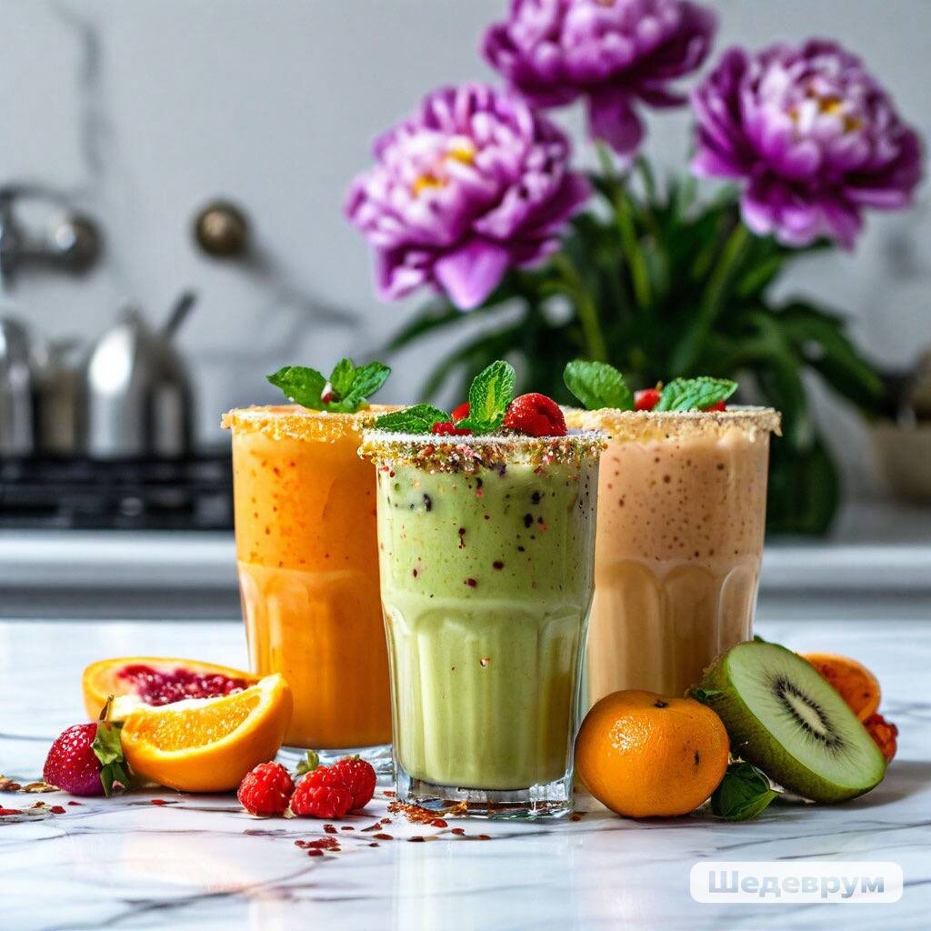 Привет, дорогие друзья! Если вам хочется чего-то освежающего, яркого и невероятно вкусного, этот смузи как раз для вас! Я обожаю такие яркие и сочные коктейли, потому что они не только заряжают энергией, но и насыщены витаминами, антиоксидантами и минералами. Мандарины, киви, малина и клубника в сочетании с кокосовым молоком создают по-настоящему уникальный вкус, а свежая мята добавляет освежающую нотку. Это идеальный напиток для начала дня или как перекус между приемами пищи! Для еще более яркого вкуса и дополнительной пользы можно добавить в смузи немного сока лайма или лимона — это придаст напитку легкую кислинку и сделает его еще более освежающим. Приятного аппетита! Наслаждайтесь этим фруктовым райским напитком, который подарит вам заряд бодрости, витаминов и отличное настроение на весь день!