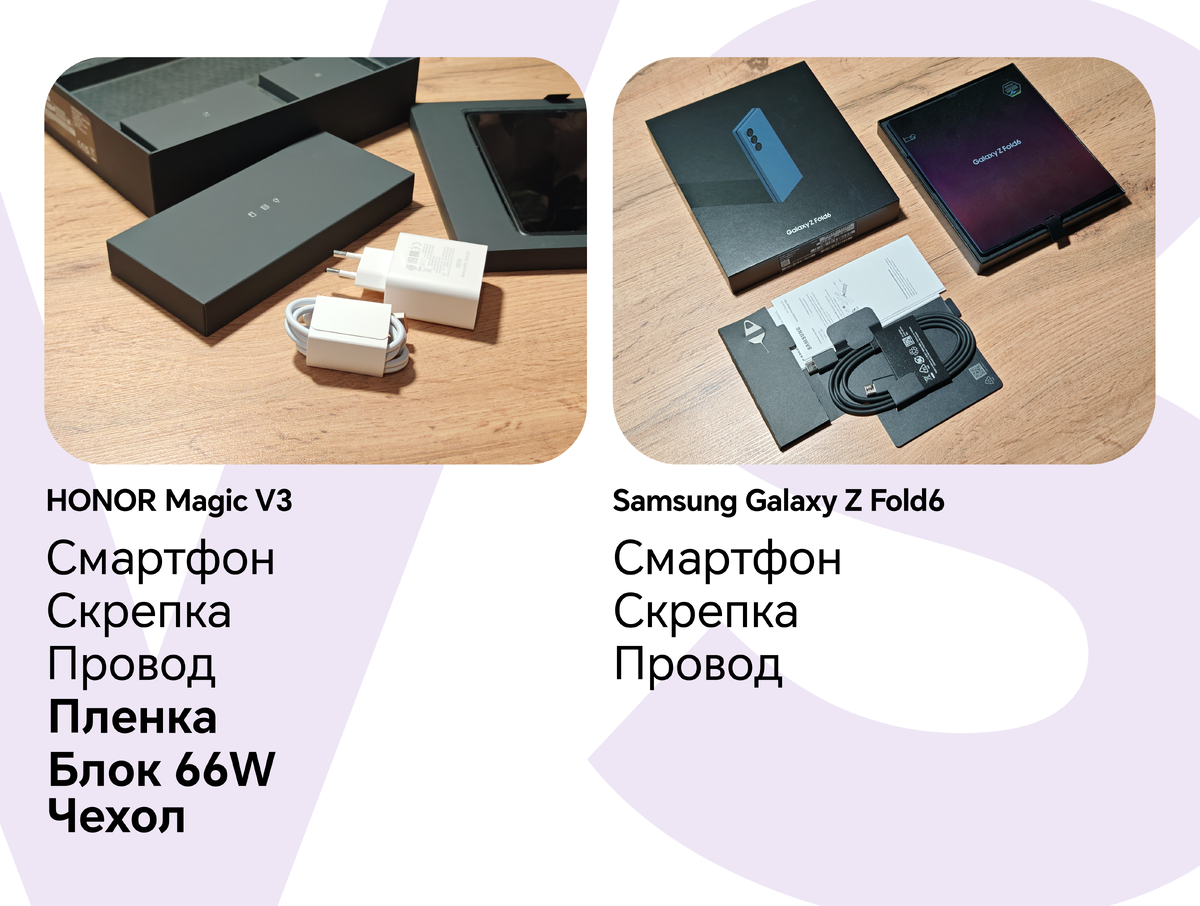 Различия начинаются уже при распаковке. У Magic V3 массивная коробка, а у Z Fold6 почти в 2 раза меньше! Тек