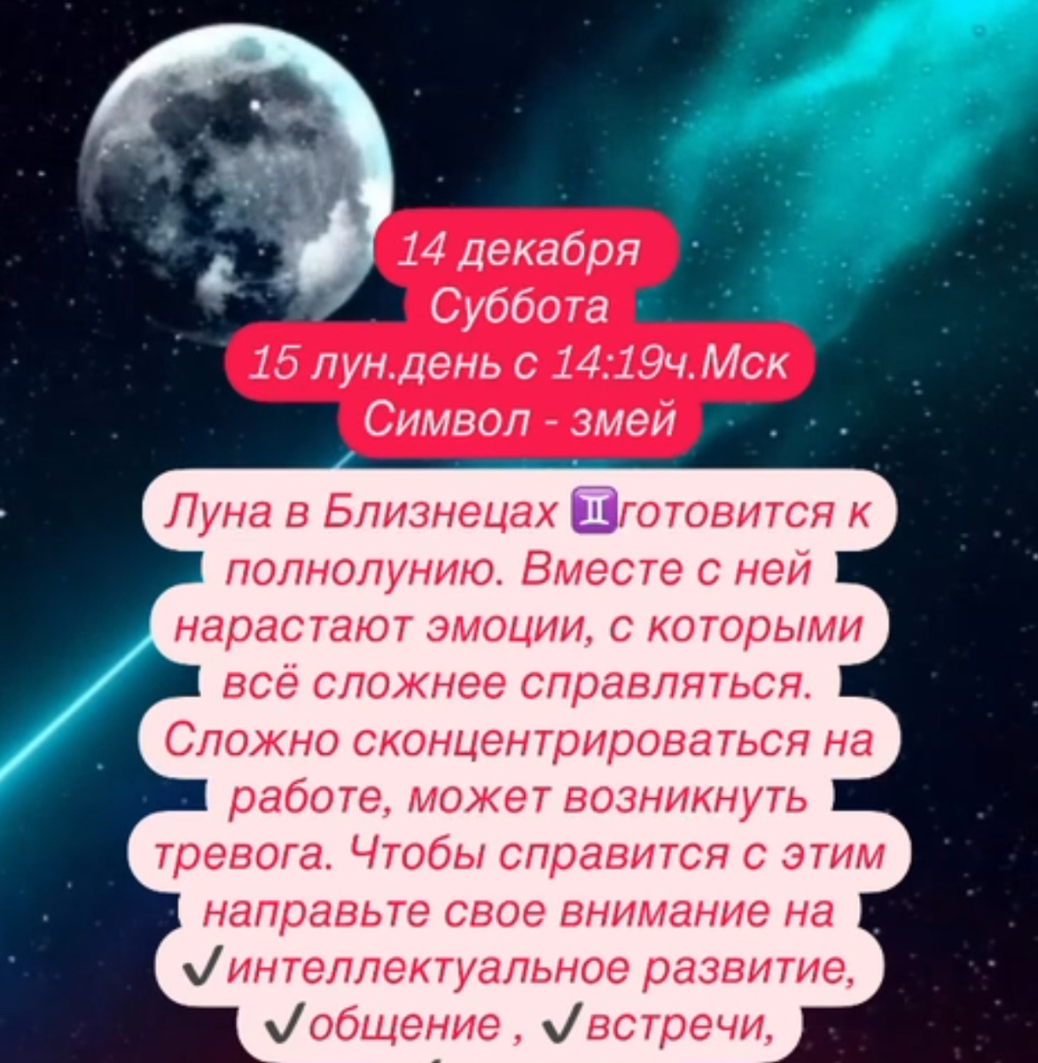Луна в Близнецах ♊️готовится к полнолунию. Вместе с ней нарастают эмоции, с которыми всё сложнее справляться. Сложно сконцентрироваться на работе, может возникнуть тревога. Чтобы справится с этим направьте свое внимание на ✔️интеллектуальное развитие, ✔️общение , ✔️встречи, ✔️шоппинг. В целом звёзды 💫 обещают активный и насыщенный событиями день ♥️ Сны не имеют большого значения, могут показать ваши скрытые способности. ❌стрижка ✅покупки #гороскоп #астрология #луна #овен #телец #близнецы #рак #лев #дева #весы #скорпион #стрелец #козерог