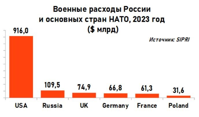 Путин и Рютте нашли друг друга. Оба решили резко увеличивать расходы на оборону, правда, именно Путин начал это первым. В 2022-23 годах военные расходы России резко оставили за спиной затраты Германии, Франции и Великобритании, хотя до этого десятилетиями поддерживался примерный паритет. Это стало всерьез беспокоить западноевропейские страны... Хотя с чего бы это? На 2023 год общий военный бюджет стран НАТО составлял около 1,5 триллиона евро. По сравнению со $110 млрд России, к тому же активно сжигающей свой военный потенциал в конфликте с Украиной. Даже только западноевропейский бюджет на оборону в 6 раз выше российского, а с учетом американского — в 15 раз. И это с учетом того, что Россия тратит на оборону 6% ВВП, а страны НАТО — только 2%. Еще сильнее отставание России по объему ВВП, при том, что бОльшая часть нашего ВВП приходится на сырье и энергетику. Начинать гонку вооружений при таких раскладах — чистое сумасшествие. У России нет ни одного шанса ее выиграть. Впрочем, что тут но