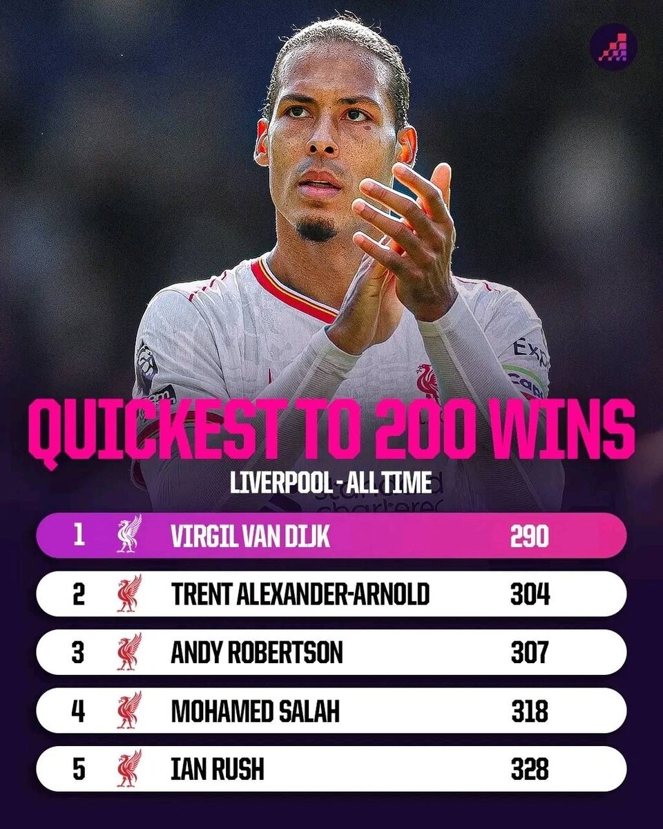В шестом туре общего этапа Лиги чемпионов «Ливерпуль» с минимальным счетом 1:0 обыграл «Жирону», помог Мо Салах, реализовавший пенальти на 63-й минуте игры. Встреча стала совершенно особенной для Вирджила Ван Дейка, ведь он одержал 200-ю победу в футболке «красных». Голландец пересек эту отметку быстрее всех в истории «Ливерпуля» – для рекорда ему потребовалось провести 290 матчей за мерсисайдцев во всех турнирах До Вирджила рекорд принадлежал Тренту, Александер-Арнолд свою 200-ю победу в составе «красных» он одержал в 304-й игре. В топ-5 футболистов, которые быстрее остальных достигли 200 побед в составе «Ливерпуля», входят еще два действующих игрока мерсисайдцев – Энди Робертсон и Мо Салах. А замыкает пятерку великий Иан Раш. Поздравляем Вирджила! Инсайдер назвала игрока «Ливерпуля» из тройки Салах − Трент − Ван Дейк, который уйдет из клуба. Вот кто это будет 🎥 Мо Салах назвал любимого одноклубника в «Ливерпуле». Фанаты благодарны египтянину за слова о партнере 🤯 Топ-10 худших янва