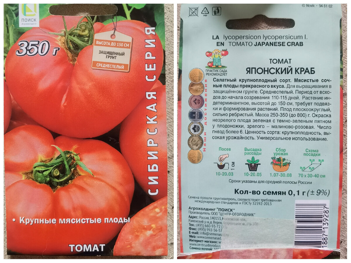 Друзья, есть у меня сказка-неотвязка с простейшим, казалось бы, сортом - Японский Краб. Сорт старый, куча агрофирм его выпускает, он ходит по рукам и в разных коллекционных формах. Но со мной этот сорт все никак не встретится))))) Выращиваю третий раз и вырастает что-то свое собственное, но никак не Японский Краб))) В 2022г я впервые посеяла семена томата Японский Краб от агрофирмы Поиск вот из такой пачки. В целом описание похоже на Госреестр. Это должен быть розовоплодный, плоскоокруглый, ребристый томат. Но у меня из этого пакета выросли крупные, красные, круглые плоды! За вкус я продолжаю ежегодно повторять доставшуюся мне версию. Она всем прекрасна - урожайна, крупна, вкусна, ранняя, но не Краб! Этого Краба я теперь именую "Мой красный Японский краб". Мне стало даже интересно, а все ли агрофирмы фасуют странное вместо Краба? В одной из закупок разновсяких семян я заказала еще пачку томата Японский Краб. В магазине была картинка помидоров вместо фото пакетика, а я не посмотрела пр