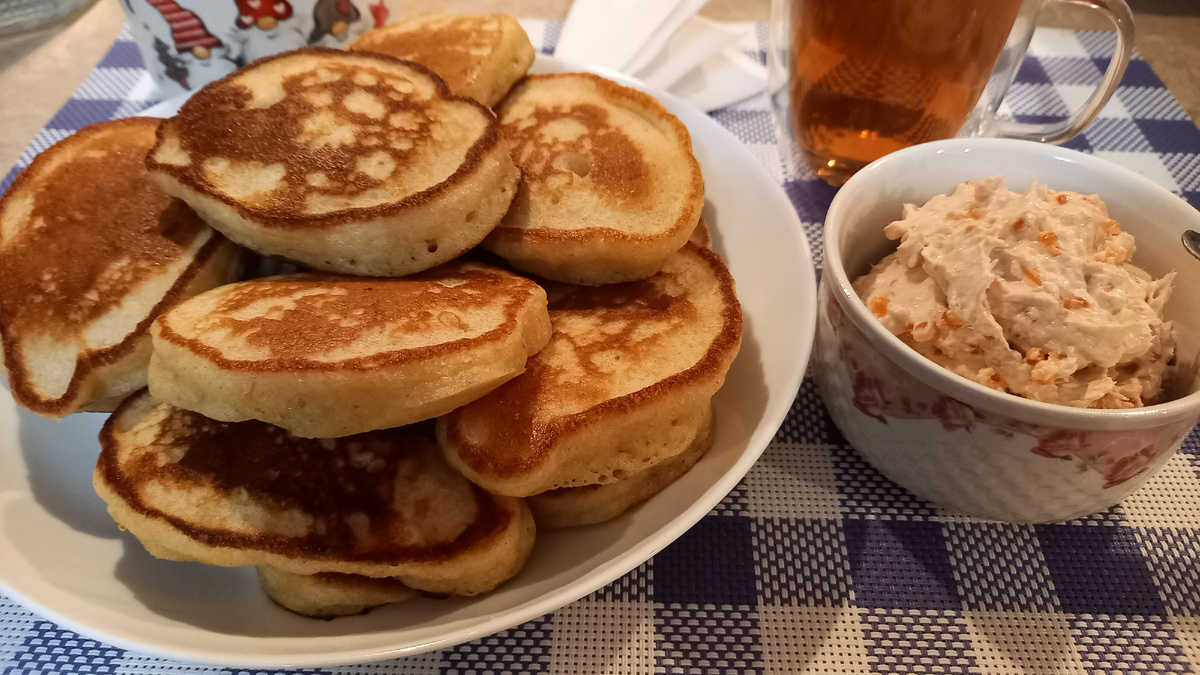 Завтрак выходного дня: дрожжевые оладьи с цельнозерновой мукой и риет из красной рыбы