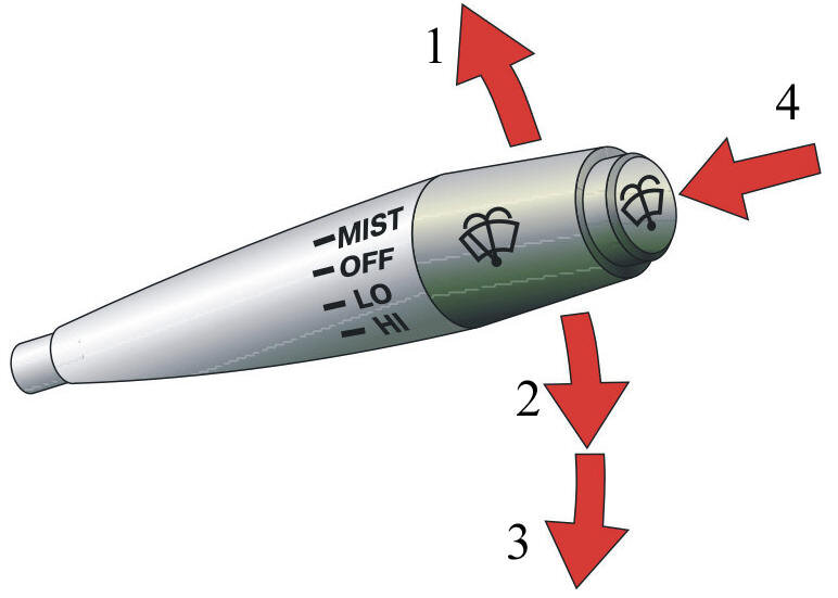 Включение очистителя и омывателя ветрового стекла (тип А) 1. Режим однократной работы 2. Малая скорость 3. Повышенная скорость 4. Включение стеклоомывателя Для включения очистителя переведите рычаг в нужное положение. Для включения омывателя нажмите кнопку (4) на торце рычага. Ключ зажигания должен находиться в положении On. Для включения однократной работы очистителя (при движении в тумане) переведите рычаг в положение MIST и отпустите. Если стеклоомыватель не включается, то проверьте наличие воды в бачке. Порядок заполнения бачка описан в подразделе 2.3. В холодную погоду перед включением омывателя включите обогрев стекла. При этом предотвращается обледенение, из-за которого ухудшается обзор. Не включайте очиститель на сухом стекле, так как щетки могут его поцарапать. Включение очистителя и омывателя ветрового стекла (тип В) 1. Режим прерывистой работы стеклоочистителя 2. Малая скорость 3. Повышенная скорость 4. Включение стеклоомываталя Для включения очистителя переведите рычаг в