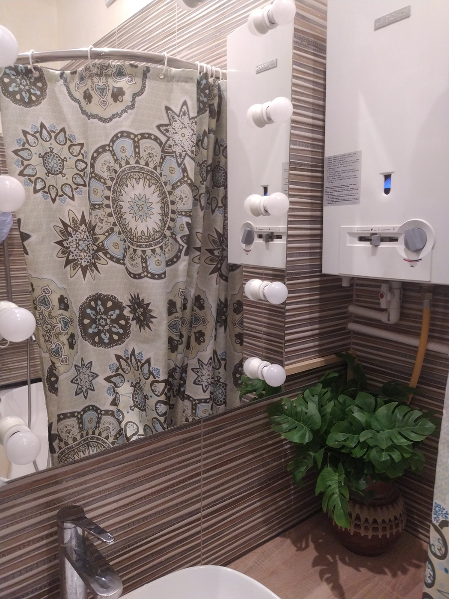 Здравствуйте, дорогие друзья! Вот я и выкладываю результаты ремонта в ванной комнате. Большую часть работы мы делали сами. Единственное, что осталось без изменений-это дверь. Все двери будем менять после того, как поменяем полы во всей квартире. Столешницу под раковину делали сам из щита ,купленного в Леруа Мерлен. Ножки к столешнице купили там же. Чтобы закрыть некрасивый угол, где находятся провода и шланг от колонки, поставила вазу с искусственной зеленью. Остаток столешницы прикрепили на короб для стиралки. Получилась еще одно место для хранения. С другой стороны двери повесили шкафчик, а над ним сушилка для мелких предметов. Купили зеркало с яркой подсветкой и изогнутую штангу по форме ванной для шторки. Установили тропический душ. И электрический полотенцесушитель. Так выглядит подсветка полочек. Ее тоже делали сами. Сверху прикрепили полку для не очень нужных в повседневности вещей. И самая главная вещь-королева ванной комнаты! Полностью акриловая угловая ванная с ортопедической