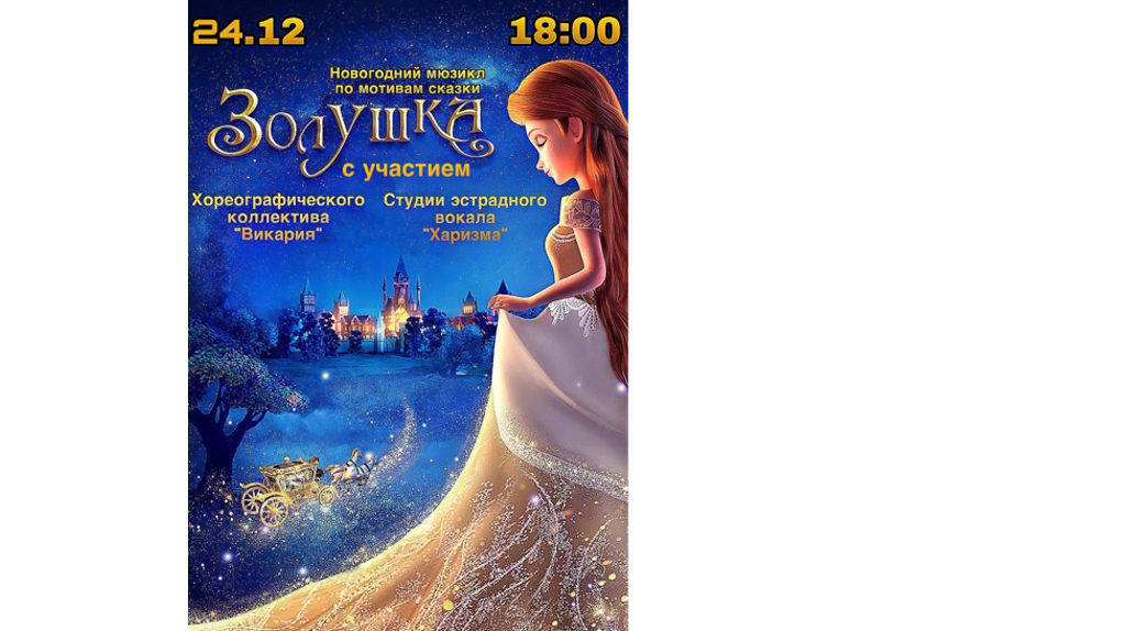 Дом культуры поселка Октябрьский приглашает на новогодний мюзикл "Золушка" с участием хореографического коллектива "Викария" и студии эстрадного вокала "Харизма". Мероприятие пройдет во вторник, 24 декабря. Начало в 18:00.