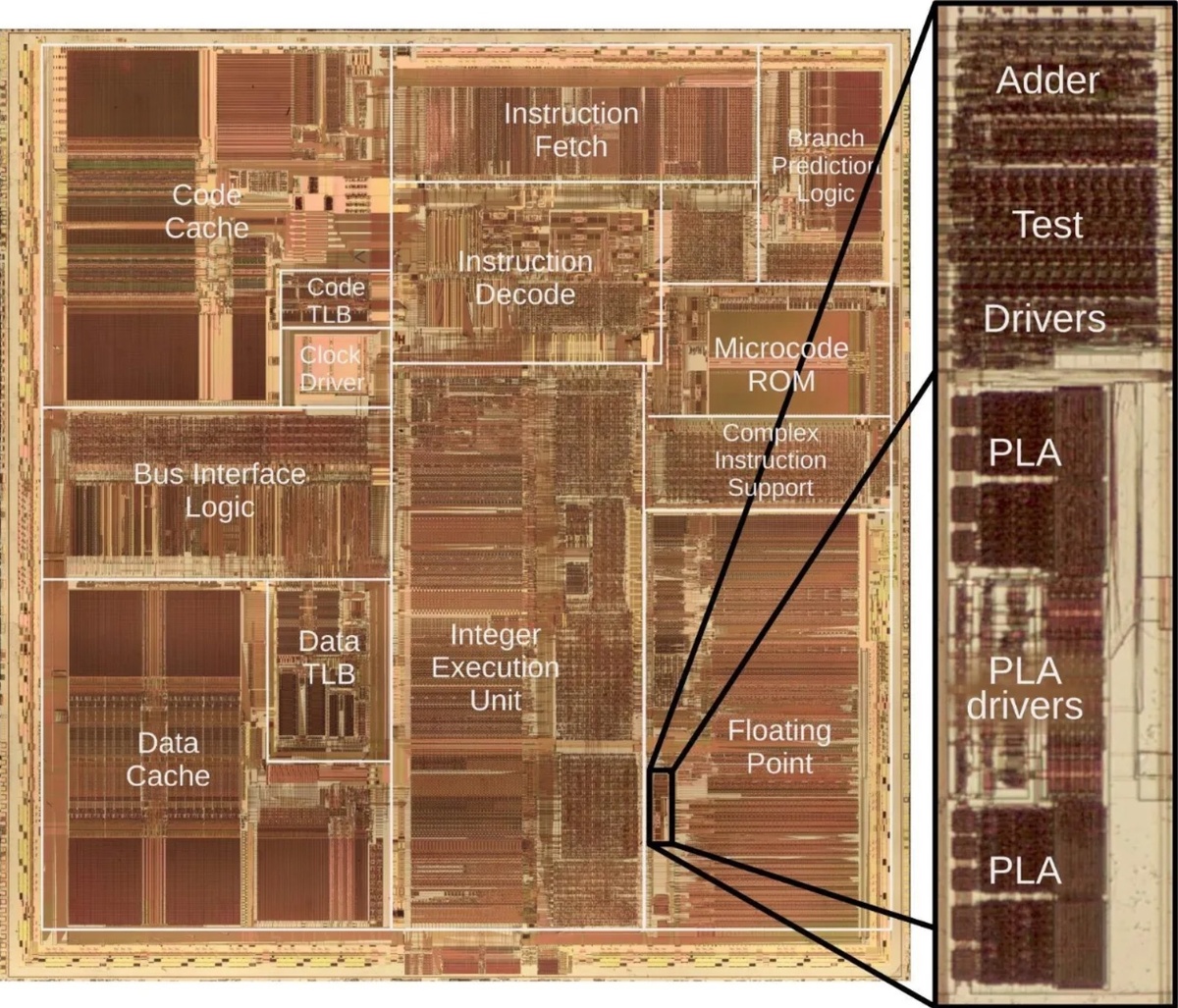 Известный историк вычислительной техники и реверс-инженер Кен Ширрифф недавно обнаружил в оригинальном процессоре Intel Pentium 90-х годов транзисторы, вызвавшие пресловутую «ошибку FDIV», которая привела к массовому отзыву продукции компании на сумму $475 млн в 1994 году. Ширрифф провёл настоящее исследование, изучив под микроскопом Programmable logic array (PLA) — программируемый логический массив (матрицу) — разновидность программируемого логического устройства, которое используется для реализации комбинационной логики схем. В этой матрице хранится неисправная таблица деления, и в итоге специалист выяснил первопричину первого крупного сбоя Intel 30 лет назад. Исследователь представил изображение кристалла процессора оригинального чипа Pentium — первого процессора Intel на архитектуре P5, которая помогла компании стать известной на весь мир. Это поколение Pentium было изготовлено по 800-нм техпроцессу, а кристалл удалось показать с помощью совмещённых фотографий, сделанных под микрос