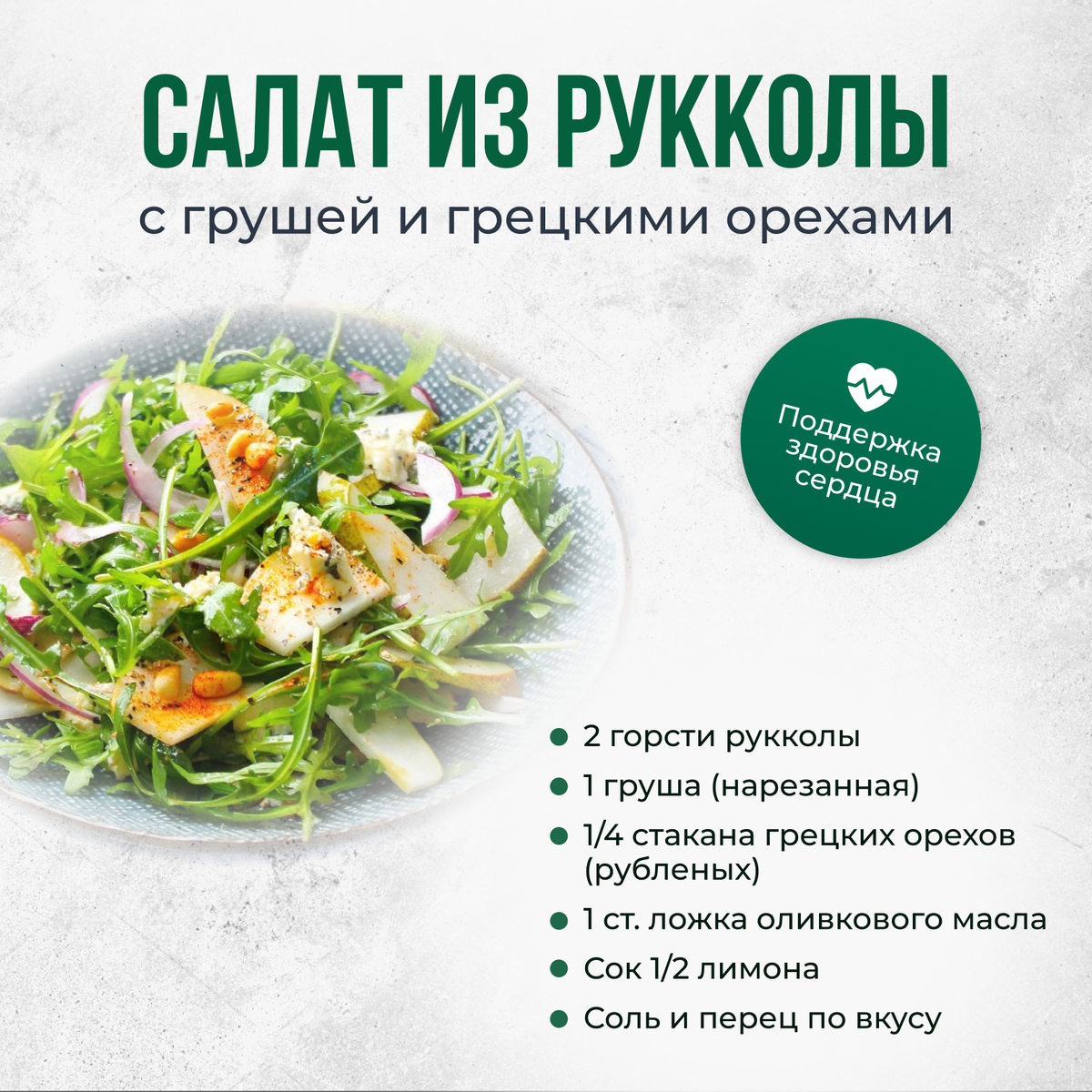 Этот салат поддерживает здоровье сердца благодаря полезным жирам в орехах и антиоксидантам в грушах. Ингредиенты: 2 горсти рукколы 1 груша (нарезанная) 1/4 стакана грецких орехов (рубленых) 1 ст. ложка оливкового масла Сок 1/2 лимона Соль и перец по вкусу Инструкция: В миске смешайте рукколу, грушу и орехи. Приготовьте заправку из оливкового масла, лимонного сока, соли и перца. Полейте салат заправкой и аккуратно перемешайте. Изюминка: Подавайте с добавлением сыра фета для пикантности. Салат из рукколы с грушей и грецкими орехами — это свежий и легкий салат, который поддерживает здоровье сердца и насыщает витаминами.