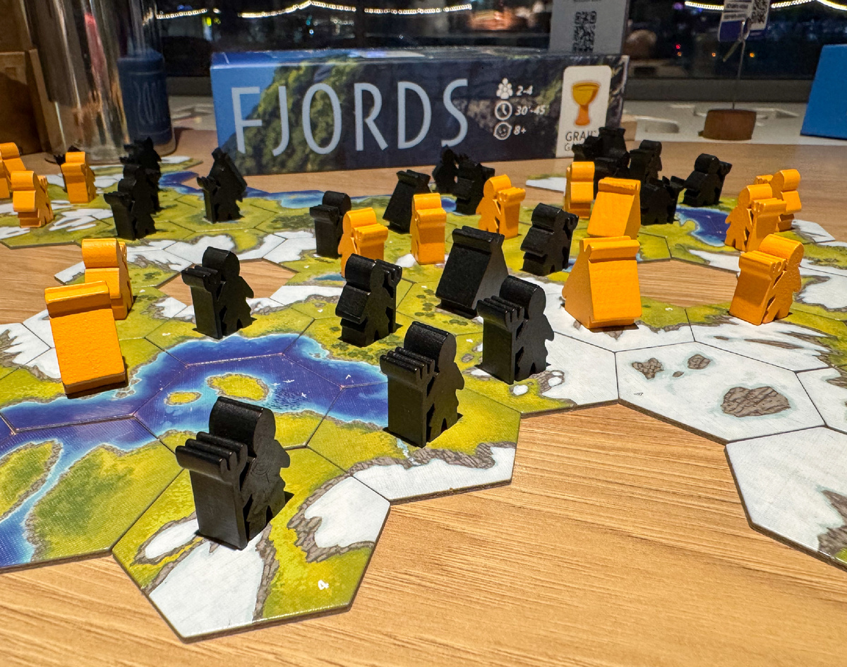 В моей семье «Фьорды» были приняты тепло: Кира просто очень любит конфликтные короткие игры, а Виталя, как и я, ещё из тех настольщиков, кто заигрывал «Терру Мистику» и познал, что значит качественное взаимодействие. Здесь оно, конечно, элементарное в плане количества пластов, но чувствуется в моменте довольно остро: я уже упоминала «Голубую лагуну» Книции — и, на мой взгляд, вторая фаза игры просто вторит выставлению хижин у Книции. Хотяяяя… раз игра 2005 года, получается, что «Голубая лагуна», появившись много позже, вобрала конкуренцию «Фьордов»:)