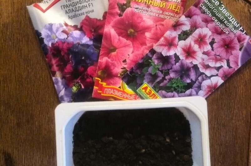 Еще одна важная тонкость при посеве семян петунии. После посева емкость накрываем пленкой или крышкой. Важно, чтобы внутри образовался благоприятный микроклимат для прорастания семян.