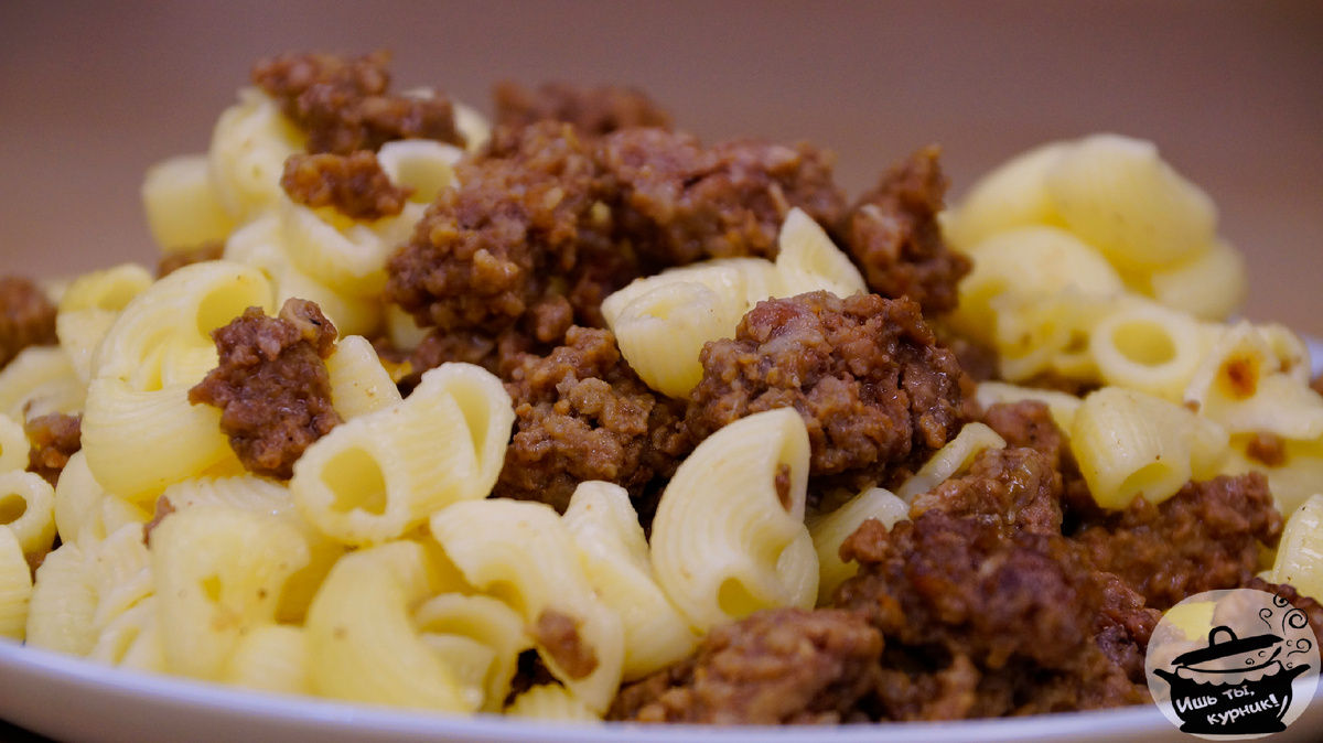 Классические макароны по-флотски по рецепту "Кулинарии" 1955 года. Говядину, баранину или свинину пропустить через мясорубку и обжарить на сале. Мясо положить в посуду, добавить пассерованный на масле мелко нарезанный лук, налить бульон и тушить мясо до готовности. Макароны отварить в подсоленной воде и, слив отвар, смешать их с тушеным мясом. Макароны 80, мясо 75, масло топленое 15, лук 20, бульон 30, сало свиное, говяжье топленое 10.