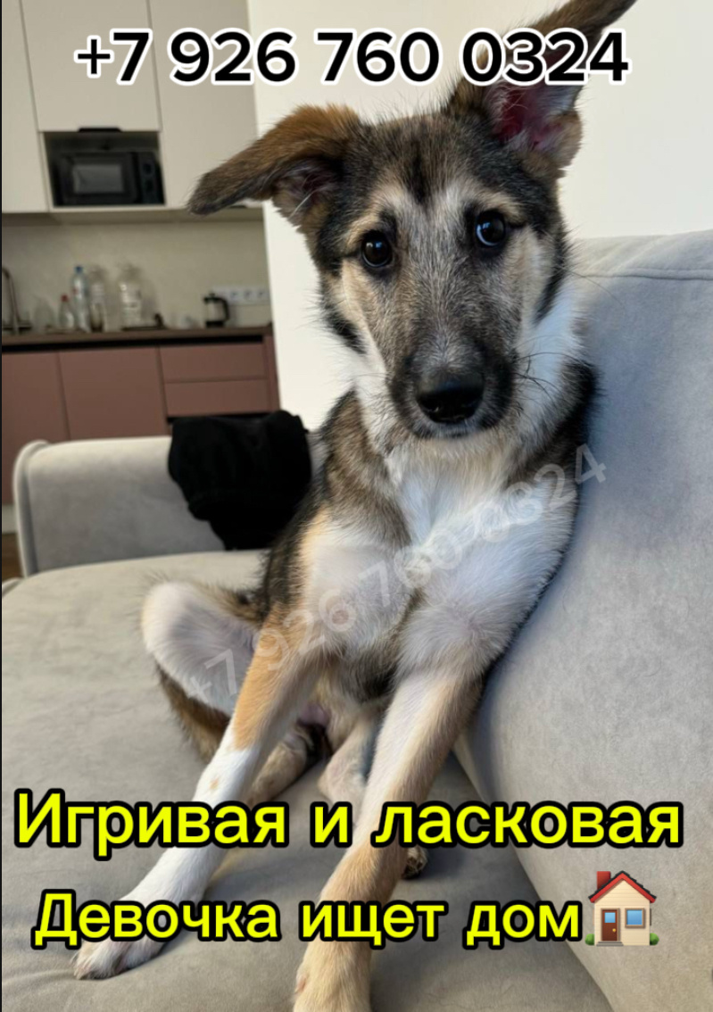 Девочка, возраст около 6 - 7 месяцев. Малышка очень игривая и ласковая, совсем не пугливая. Внешне была очень чистенькой, но спокойно дала себя помыть шампунем от блох, ест аккуратно (но очень быстро 🙂), легко освоила поводок. Осмотр у ветеринарного врача прошла, состояние здоровья хорошее. Когда вырастет, будет среднего размера. Сейчас в холке примерно 45 см. Хорошо ладит с другими животными, очень игривая, поэтому на прогулках просится побегать, и в целом, любит активности. Девочка ориентирована на человека, очень тактильная, любит обниматься, целоваться, всегда устраивается спать поближе к человеку. В восторге от мячика и любых игрушек ☺️ Отдам в добрые руки, в квартиру/дом (не на цепь), с дальнейшим ненавязчивым отслеживанием судьбы. Номер телефона: +7 926 760 0324