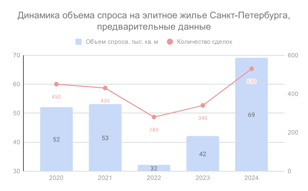Покупателей очень дорогих квартир в новостройках не остановило повышение ключевой ставки и закрытие льготных программ кредитования. Эксперты подвели предварительные итоги 2024 года на рынке элитного жилья Петербурга и выяснили: уровень спроса оказался самым высоким за последние 10 лет. Восстановление покупательской активности после снижения в 2022 году наблюдалось на рынке начиная с III квартала 2023 года, после чего на протяжении 2024 года фиксировался устойчивый интерес покупателей к элитному жилью. В результате объем спроса в 2024 году увеличился на 67% по общей площади лотов и на 55% по количеству сделок по сравнению с 2023 годом. Источник: NF Group Research В 2024 году наибольшая доля сделок совершалась с квартирами и апартаментами в уже введенных в эксплуатацию новостройках, по итогам года этот показатель может достичь 81% от общего количества сделок (+13 п. п. за год). Средняя площадь приобретенного лота по итогам 2024 года может составить 130,6 кв. м, что на 9,2 кв. м больше ан