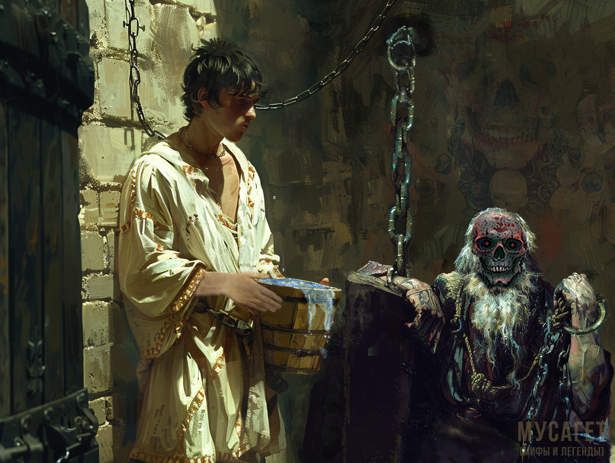 Худой измождённый пленник висел на цепях, безвольно склонив голову. Казалось, что от него остались лишь кожа да кости. «Принеси мне воды», – почти беззвучно прошептал он. Пожалев бедолагу, Иван-царевич принёс ему ведро. Узник опорожнил его с такой лёгкостью, будто это был всего лишь стакан. «Ещё…» – просил он пересохшими губами.