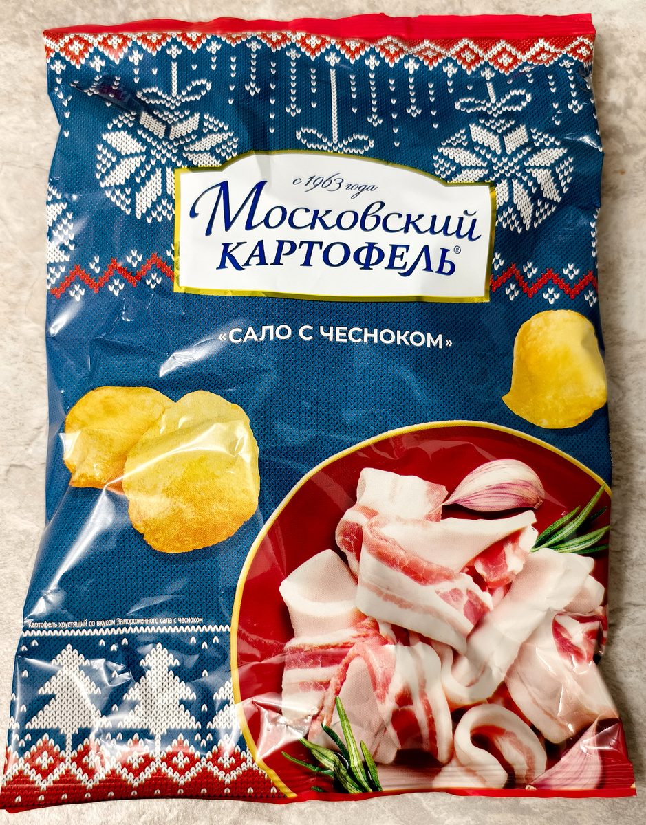 Наткнулся в Перекрестке на такую новинку. Чипсы от Московского картофеля со вкусом "сало с чесноком". Стоили по акции 99 рублей. У упаковки новогоднее оформление. Не знаю даже сало это новогодний вкус или нет? У кого то будет сало с чесноком на праздничном столе?