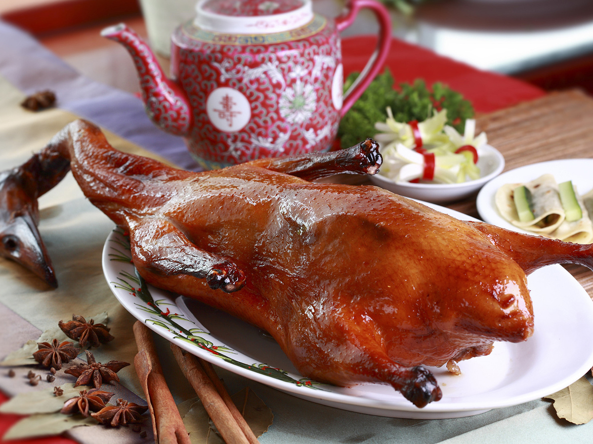 Когда мы говорим о китайской кухне, то первым делом вспоминаем об утке по-пекински. Действительно, это блюдо готовили еще во времена династии Сунн (10 — 13 века н.э.). Но как приготовить сочную утку по-пекински сегодня дома без всяких китайских премудростей (вроде дровяной печи или ячменной патоки)? Существует упрощенный рецепт, по которому утка никак не выйдет хуже. Понадобится: утка на 2,5 кг, 3 ст.л. меда, соль и молотый черный перец (по вкусу). Отрежьте у утки кончики крыльев (они чаще всего подгорают) и удалите лишний жир из брюшка (если есть). Опустите утку на 2-4 минуты в кипящую воду, пока кожа у нее не побелеет, после чего обсушите бумажным полотенцем. Смешайте соль с перцем и натрите утку снаружи и изнутри. Медом разведенным водой 1:1 обмажьте утку и подвесьте (не положите!) сушиться в прохладном помещении (например, на балконе) на ночь. В крайнем случае — поместите в холодильник, подвесив за веревочку к верхней полке, чтоб свисала до дна. Утром уложите утку в духовку на решетку-гриль грудкой вверх (поставив вниз поддон с водой) и запекайте при температуре 200 градусов 1,5 часа. Примерно через 45 минут можно накрыть ее сверху фольгой, чтоб не подгорела.