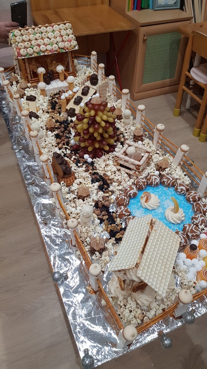 Добро пожаловать в мой дневник, где я онлайн худею на 35 кг и рассказываю о жизни нашей семьи. Для новых гостей и друзей канала: Меня зовут Александра, мне 34 года, начальный вес 105 кг, дневник веду с веса 100,5. Хочу показать ещё одну традицию нашего детского сада - пряничный дом для всех детей. Когда-то это был действительно пряничный домик, сейчас он видоизменился и вырос до размеров сладкого городка. Делают этот городок мамочки, а дети с удовольствием едят. «Дайте мне кусочек крыши», «А я хочу вот того лебедя», «Отщипну кусочек ёлочки». Вот так красиво выглядит это в темноте. У Василисы вчера был последний учебный день, учительница украсила класс и подготовила фильм. Дети пришли в школу без формы, а кто-то даже захватил пижамы, растянулись на пледах и подушках, захваченных из дома, жевали попкорн и печеньки. Мне кажется это очень классная традиция, в том году учитель делала тоже самое для деток. Из тарелочек я сфотографировала только одну. Просто я уже где-то в новогодней ночи, но
