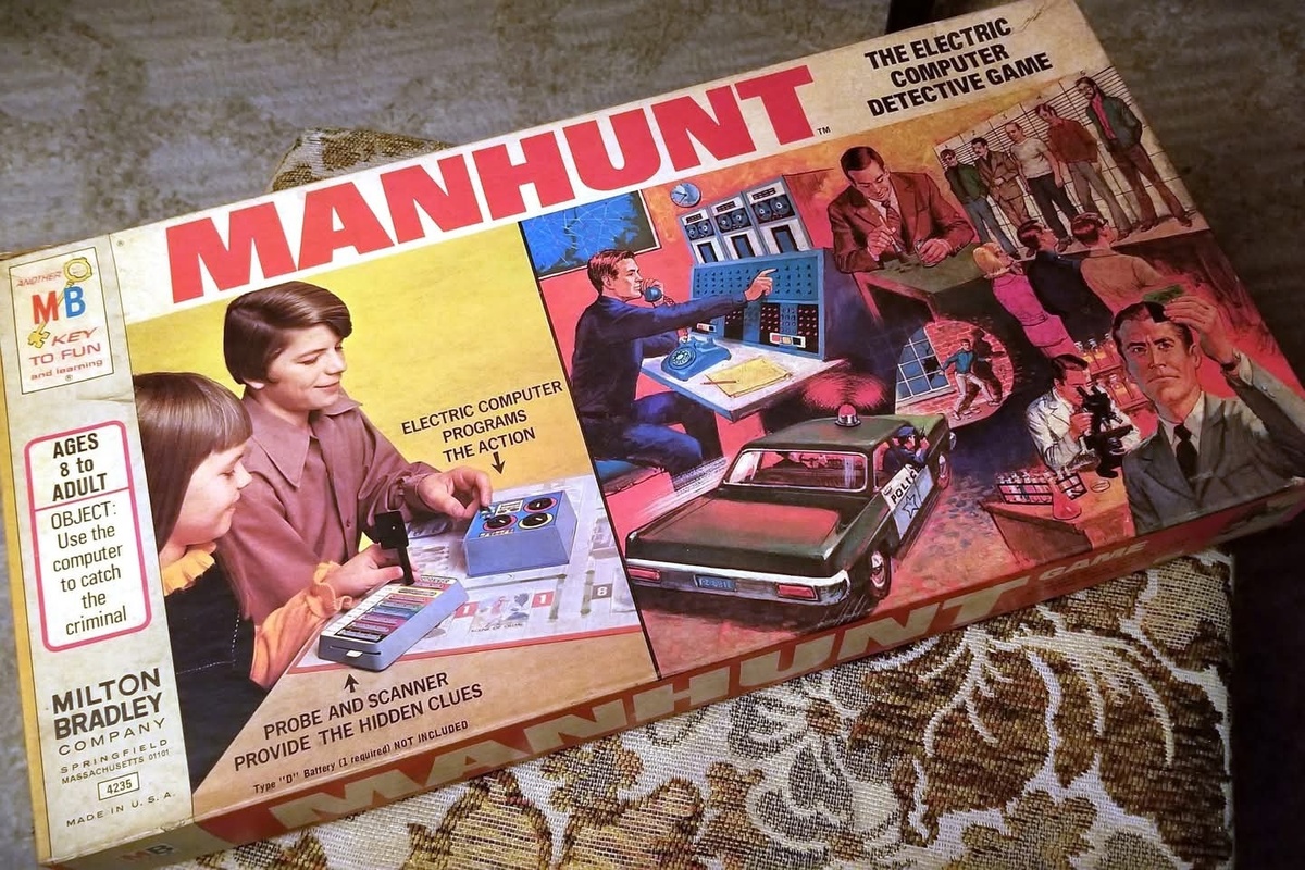 Хотелось бы рассказать о необычном представителе настольных игр: электронной компьютерной детективной игре «Manhunt». Сейчас подобные игры выпускают в виде самой игры и приложения для смартфона (яркий пример «Место преступления»). Но в 1972 году не то, что смартфонов, домашних компьютеров еще не было и первый персональный компьютер должен был появиться только через пять лет. Игра имеет «криминальный компьютер», используемый для перемещения и определения других игровых функций. На деле это вертушки, которые вы раскручиваете «включая компьютер», переведя механический переключатель в положение «On» и отпустив его. Игроки становятся детективами и работают в одиночку или с партнером, выбирая расследование убийства, ограбления или мошенничества. Для этого они посещают места преступлений и собирают улики. В игре есть 16 карт-подсказок (Clue), которые перемешиваются, и одна случайная карта вставляется в Считыватель Улик. Это дает подсказки, которые детективам понадобятся для решения преступлен