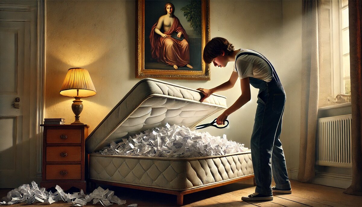 Вернувшись домой, Егор не стал церемониться: он быстро взял нож и разрезал матрас, мысленно представляя себе золотые слитки, банкноты или редкие украшения. Но внутри он обнаружил лишь ветхий наполнитель и кучу газетных вырезок. Что-то о «княжеских родах», «исторических хрониках» и «редких фамилиях». Слова «Романовы», «родословная», «князь»... Но ничего ценного.