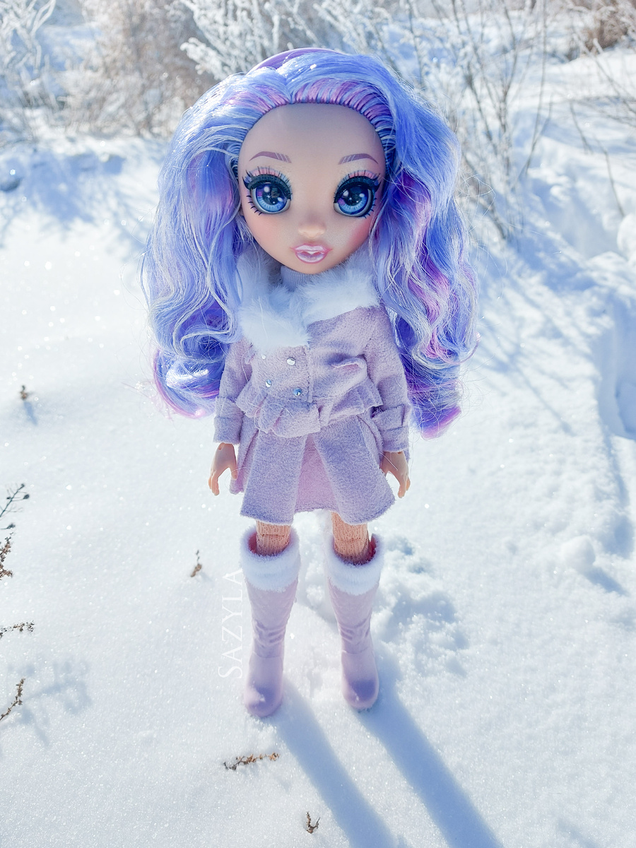 Я люблю атмосферные зимние фото кукол, но сама их делаю крайне редко. Отчасти потому, что боюсь испортить куклу, отчасти потому, что погода нас редко радует. Снег в наших широтах надо буквально ловить. Так что эти фото- результат невероятного стечения обстоятельств. Снег выпал в мой выходной, и мы помчали загород чтоб немного пофоткать. A еще у меня не так много кукол, которые подходят под такую фотосьемку. Я больше люблю летние образы. Вайолет Виллоу из Rainbow high как раз одна из таких немногих кукол. Плюсом у нее высокие пластиковые сапоги, что упрощает ee контакт снегом. Стоит так же признать, что снимки на природе не моя сильная сторона. Я больше предпочитаю спокойную обстановку, где я не замерзаю и ничего не сдувает. Но уж больно хотелось атмосферных фото. А как Вы относитесь к фото на природе, особенно зимой?