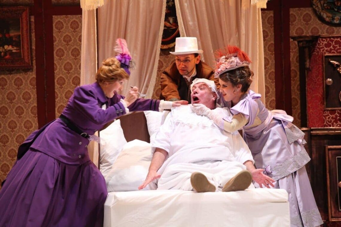 Итак, на два часа мы переносимся в провинциальный городок Санлис, расположенный к северо-востоку от Парижа, в дом 60-летнего дядюшки Рабурдена (его играет Юрий Кислинский), слывущего богачом. Именно перспектива получить заветное наследство заставляет его племянниц – госпожу Воссар (ее играет Татьяна Орлова), госпожу Фике (Лариса Шляндина) и бывшего компаньона Шапюзо (Игорь Тарасов) баловать старика подарками и всячески ему угождать.