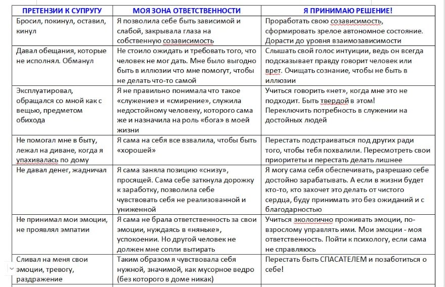 Нашла на просторах интернета табличку, сохраню себе🙏 Как стоит относиться к претензиям? тем более если эти претензии исходят из самого себя. Первое, что отследить -наличие этих претензий и увидеть что стоит за ней и взять ответственность