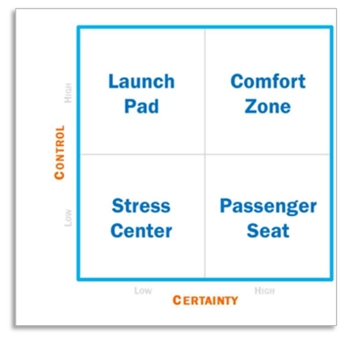 Два других квадранта Этуотера, «стартовая площадка» и «пассажирское кресло», не являются комфортными местами. Нам нравится, когда мы чувствуем, что у нас есть и высокая определенность, и контроль, мы ненавидим, когда у нас нет ни того, ни другого, и испытываем тревогу, когда у нас есть одно, но нет другого. В «пассажирском кресле» у нас высокая степень уверенности, но низкий уровень контроля; другими словами, мы уступили контроль кому-то или чему-то - примером могут служить стрижка или поездка в лифте. Нам нравится, когда мы уступили контроль добровольно, и мы нормально чувствуем себя в пассажирском кресле, если у нас есть высокая уверенность в том, что все сложится хорошо. Люди садятся в самолеты, полагая, что они благополучно приземлятся.