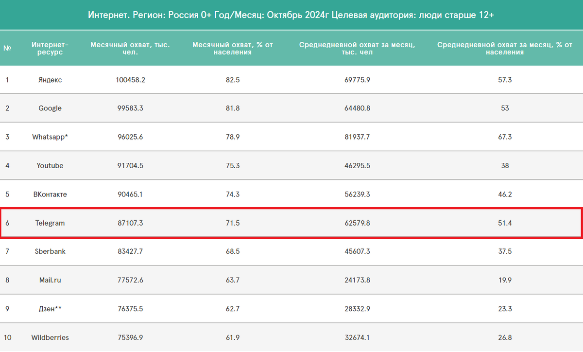 По данным Mediascope Cross Web за октябрь 2024 года, месячный охват Telegram – 71,5% от населения России, а среднедневной охват – более 51%. То есть каждый день более половины жителей России заходит в мессенджер – это колоссальное вовлечение, и процент будет только расти.
