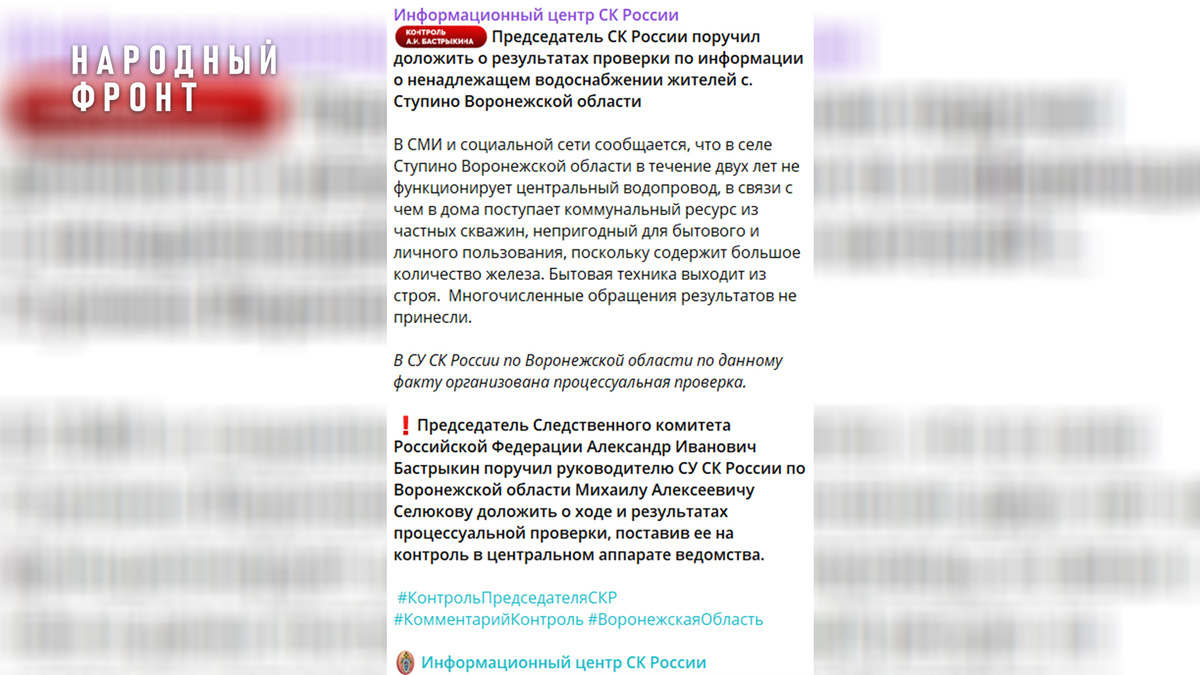 Глава СК Российской Федерации Александр Бастрыкин поручил руководителю СУ Следственного комитета России по Воронежской области доложить о ходе и результатах проверки. Об этом сообщили в официальном телеграм-канале ведомства. Напомним, что после выхода сюжета Народного фронта об отсутствии надлежащего водоснабжения в селе Ступино Рамонского района, в СУ СК России по Воронежской области сообщили о проведении процессуальной проверки по данному факту.