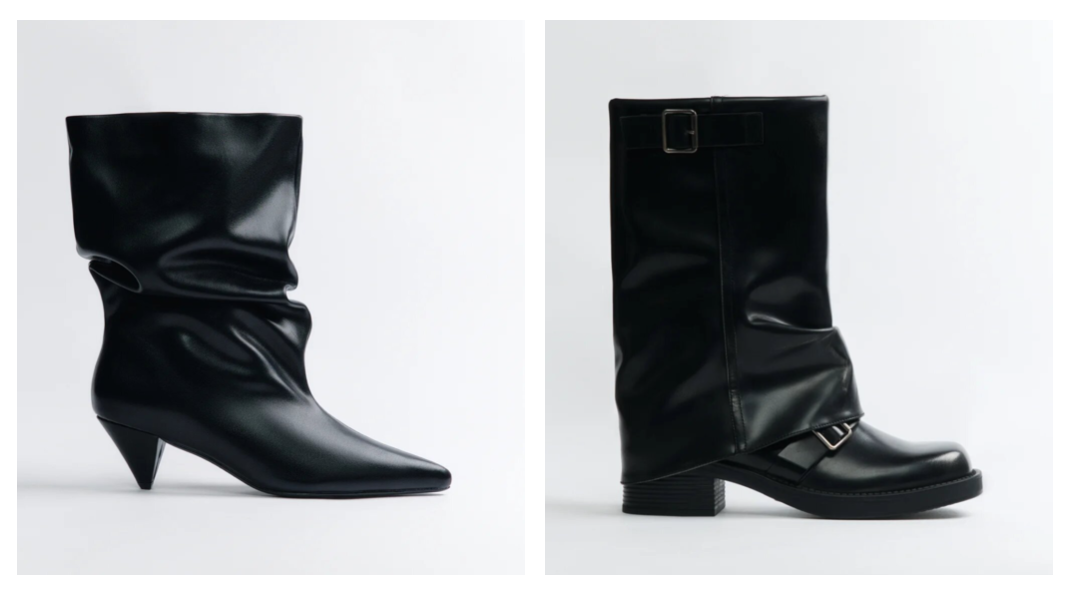 Итак, задачка! У нас есть две пары обуви: изящные ботильоны на маленьком каблучке с широким приспущенным голенищем и массивные байкерские сапоги.