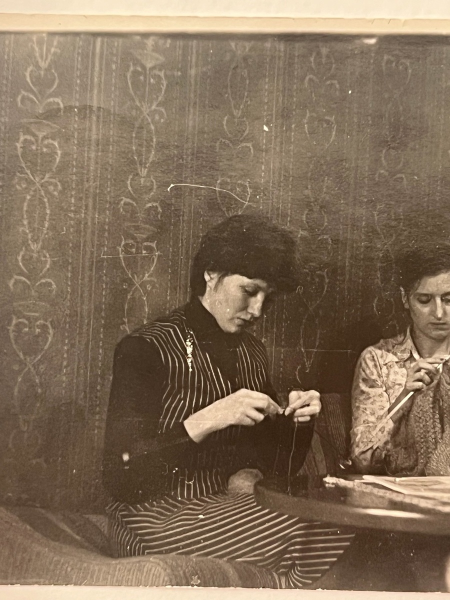 Мама держала спицы как столовые приборы в приличном обществе. Рабочая нить с указательного уходила вниз под средний палец, выходила на верх безымянного. И всё, дальше свободно к клубку.