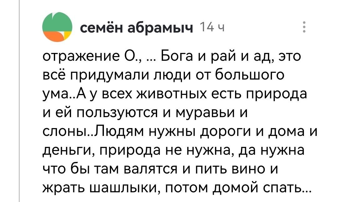 Семён Абрамыч, Отражение О, отвечает. Я тоже так думал, а потом произошло следующее. Что есть мысль? Нет мысли — нет меня, нет добра, то и нет зла, нет мира, нет войны, нет ада и лукавого, нет рая, нет Бога. Зло равно война, ад, лукавый, смерть, тьма, игра, ненависть и т. д. по грехам, список велик для тех, кто не вник. Добро равно мир, свет, рай, Бог, жизнь. Мысль — это я. Есть мысль — есть я, есть добро и зло. Значит, есть Бог и есть лукавый, рай и ад, а уж образов, которые видят люди, великое множество вариаций, проявления добра и зла и их противостояние, зло порабощает и навязывает веру в неверу, это и есть толерантность или отсутствие иммунитета к сопротивлению, то есть отсутствие сознания, понимания о том, что ты сам без сознания не живёшь, а играешь мыслями в жизнь, для жизни ты мёртв, пока спишь без движения и жанглируешь верой в неверу. Вывод: я просто верю во всё то, что я только что описал вам. Стало быть, я верю в Бога. И я не верю тем, кто лукаво верит в то, во что он н