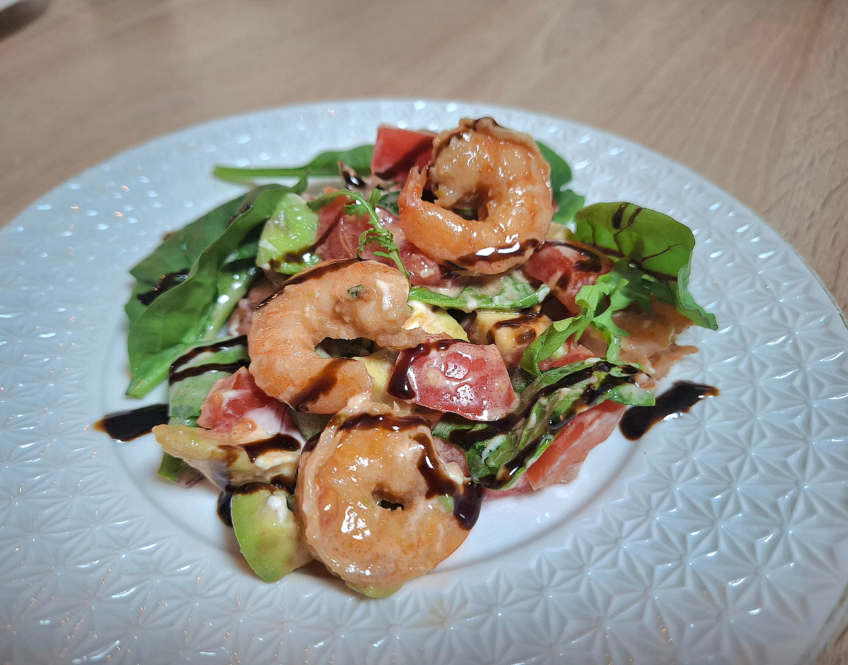 Интересный, сочный и простой в приготовлении салат с креветками, помидорами и авокадо. Вкус креветок отлично дополняет пряный вкус руколы. Вместо обычных помидор можно положить помидорки черри, они подарят салату сочность и сделают немного сладковатым. Благодаря авокадо и творожному сыру появляется интересная текстура. Салат достаточно быстро готовится. Самое сложное, что придётся сделать, – это обжарить креветки. ИНГРЕДИЕНТЫ: 🥗 Креветки 300 г. 🥗 Авокадо 1 шт. 🥗 Помидоры 1 шт. 🥗 Зелень ( у меня - это рукола, шпинат, мангольд) 🥗 Лимон 🥗 Творожный сыр 50г. 🥗 Чеснок 1 зубчик 🥗 Кунжут 🥗 Соевый соус 🥗 Оливковое масло 🥗 Бальзамический топпинг Приготовление: 1. Почистила креветки (Либо можете купить сразу готовые очищенные). 2. Мариную креветки: Оливковое масло, соевый соус, чеснок, лимонный сок. Даже 5 минут будет достаточно. 3. В миску, где будет салат, режу помидоры. Я взяла обычные и порезала кубиками, но если у вас черри - то пополам. 4. В отдельной миску режу авокадо к