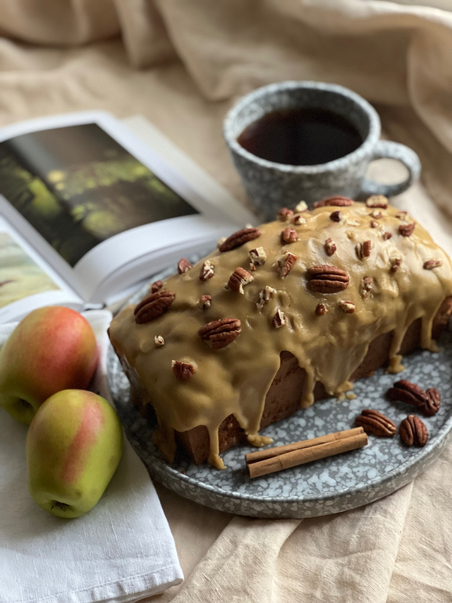 Масло растопите с сиропом, добавьте просеянную (если у вас без комочков, можно сразу) сахарную пудру, полейте на кекс, украсьте пеканом.
