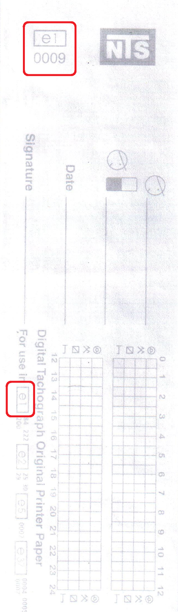 На обратной стороне распечатки с карты или тахографа, должен быть нанесен знак официального утверждения типа контрольного устройства "е1", согласно приложению ЕСТР: ТРЕБОВАНИЯ К КОНСТРУКЦИИ, ИСПЫТАНИЮ, УСТАНОВКЕ И ОСМОТРУ ЦИФРОВОГО КОНТРОЛЬНОГО УСТРОЙСТВА, ИСПОЛЬЗУЕМОГО НА АВТОМОБИЛЬНОМ ТРАНСПОРТЕ 1. Знак официального утверждения: - прямоугольник, в котором проставлена буква "е", за которой следует указанный ниже общепринятый отличительный номер страны, предоставившей официальное утверждение. 2. Знак официального утверждения проставляется на табличке описания каждого контрольного устройства и каждого регистрационного листка.