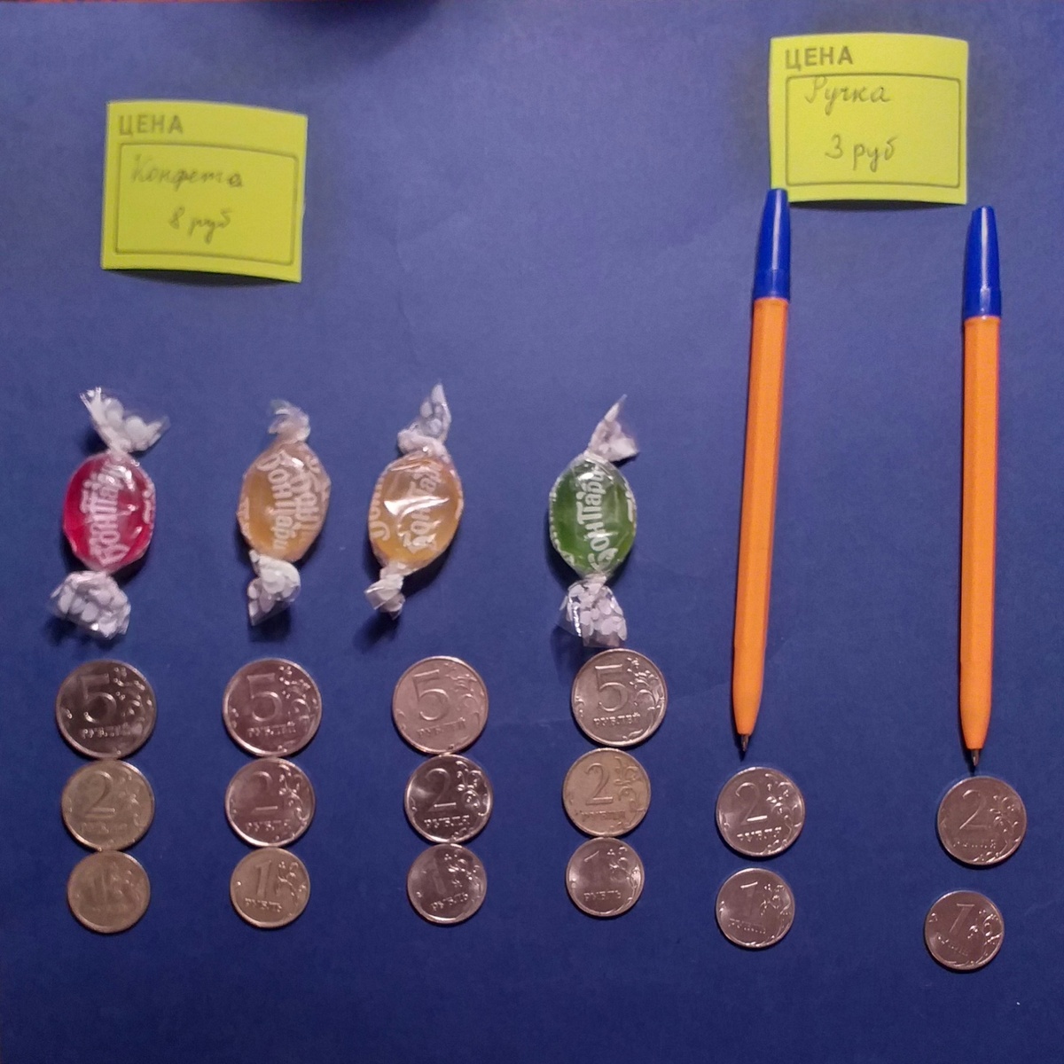 При решении задач запишите действие сложением, потом умножением. 1. Ручка стоит 3 рубля, конфета стоит 8 рублей. Купили две ручки и четыре конфеты. Сколько стоит покупка? 2. Шар стоит 4 рубля, перевёртыш стоит 6 рублей. Купили два шара и три перевёртыша. Сколько стоит вся покупка? 3. Цветок стоит 5 рублей, волчок стоит 10 рублей. Купили два цветка и три волчка. Сколько стоит вся покупка?