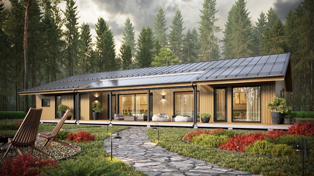 Мы редко рассказываем о новых проектах, но сейчас очень сложно удержаться. Наша типовая линейка пополнилась очень интересным домом – Сканди 260. Мы создали его специально для тех, кто хочет получить максимум удобств от одноэтажного проекта. Дом полон нетривиальных решений, которые работают на комфорт жильцов. Заинтриговали? Переходим к подробностям. Главная особенность дома – наличие комнаты-студии с отдельным входом, собственной кухней и санузлом. Ее площадь 17,6 м2. Здесь можно разместить гостей, которые захотят остаться у вас на длительное время или пожилых родственников, желающих жить вместе с вами. При желании от «студии» можно отказаться в пользу стандартной спальни. Чтобы собраться семейным кругом, в Сканди 260 есть просторная кухня-гостиная. Она спроектирована единым пространством с высоким потолком и широкоформатным остеклением. Здесь много света, воздуха и хорошо ощущается объем. Детские комнаты выделены в отдельный блок, где помимо спален есть гардеробная и санузел. Вход в