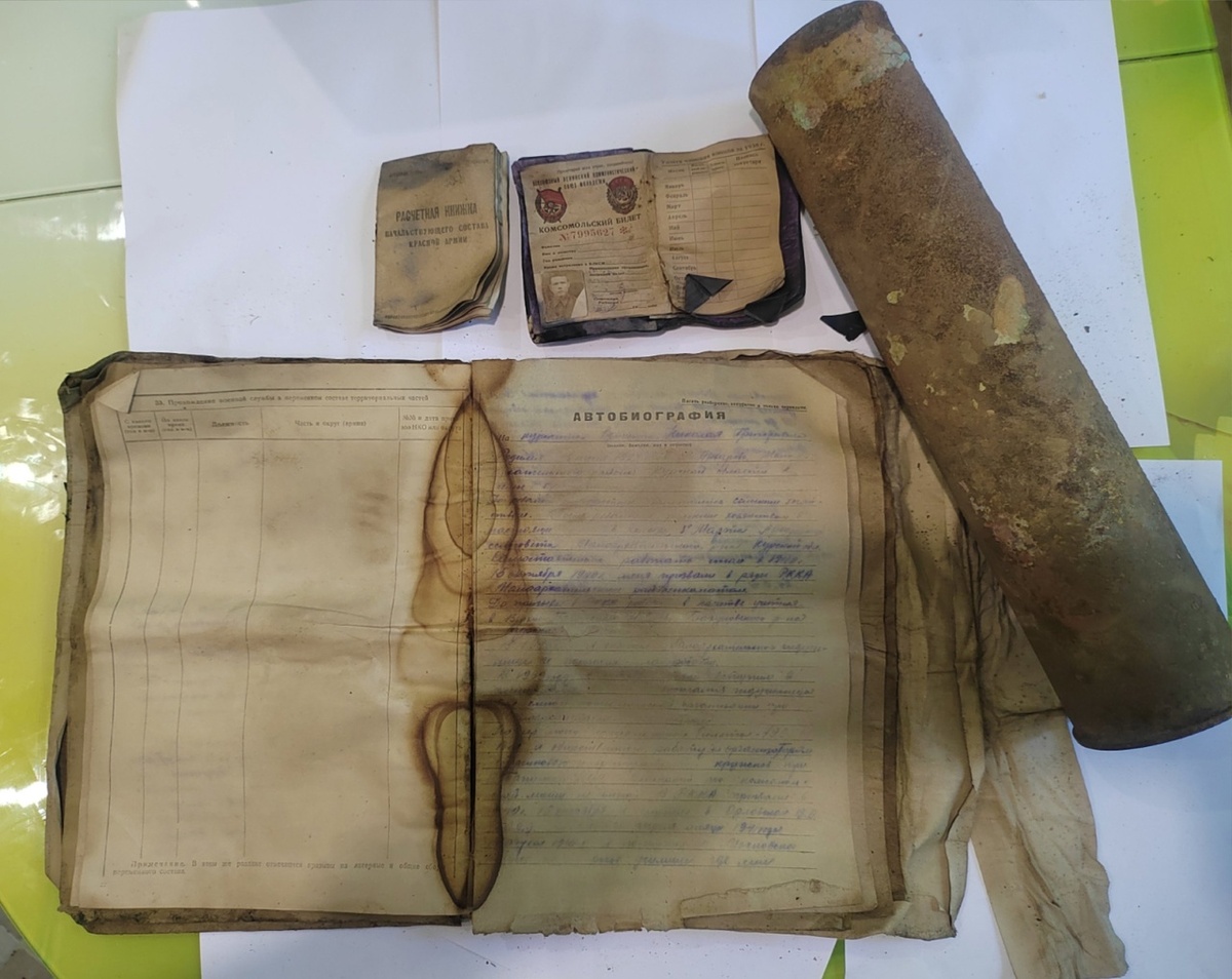 Была найдена гильза от снаряда и в ней упакованы документы. Комсомольский билет в кожаной обложке, расчетная книжка, и самое необычное - свернутое в трубку личное дело военнослужащего РККА.