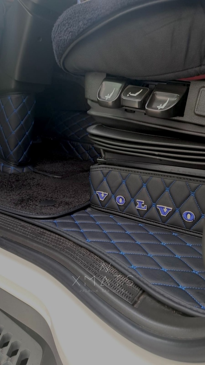 Наше ателье получает все больше заказов на пошив 3D ковриков из экокожи в салон большегрузов. Сегодня мы закончили работу над защитными покрытиями для тягача Volvo FH16. Для основных ковриков использовали черную экокожу с синей строчкой «ромб», для дополнительных – текстиль. Чтобы сшить идеально подходящие к салону этого тягача коврики, мы сделали замеры и изготовили точные лекала с учетом всех особенностей. Покрытие из экокожи перекрывает пол в салоне, пространство под креслами и за ними. Также защищена рулевая колонка. Подиум сидений перекрыт ковриком, на котором в качестве декора закреплен логотип «Volvo» большими буквами синего цвета. Дополнительные коврики закреплены клипсами, легко снимаются, когда их нужно очистить, и без проблем устанавливаются обратно. Со стороны водителя текстильное верхнее покрытие перекрывает место отдыха и заходит под педали, совершенно не мешая управлению. Также сделан удобный подпятник. Со стороны пассажира основное покрытие из экокожи полностью перекрыт