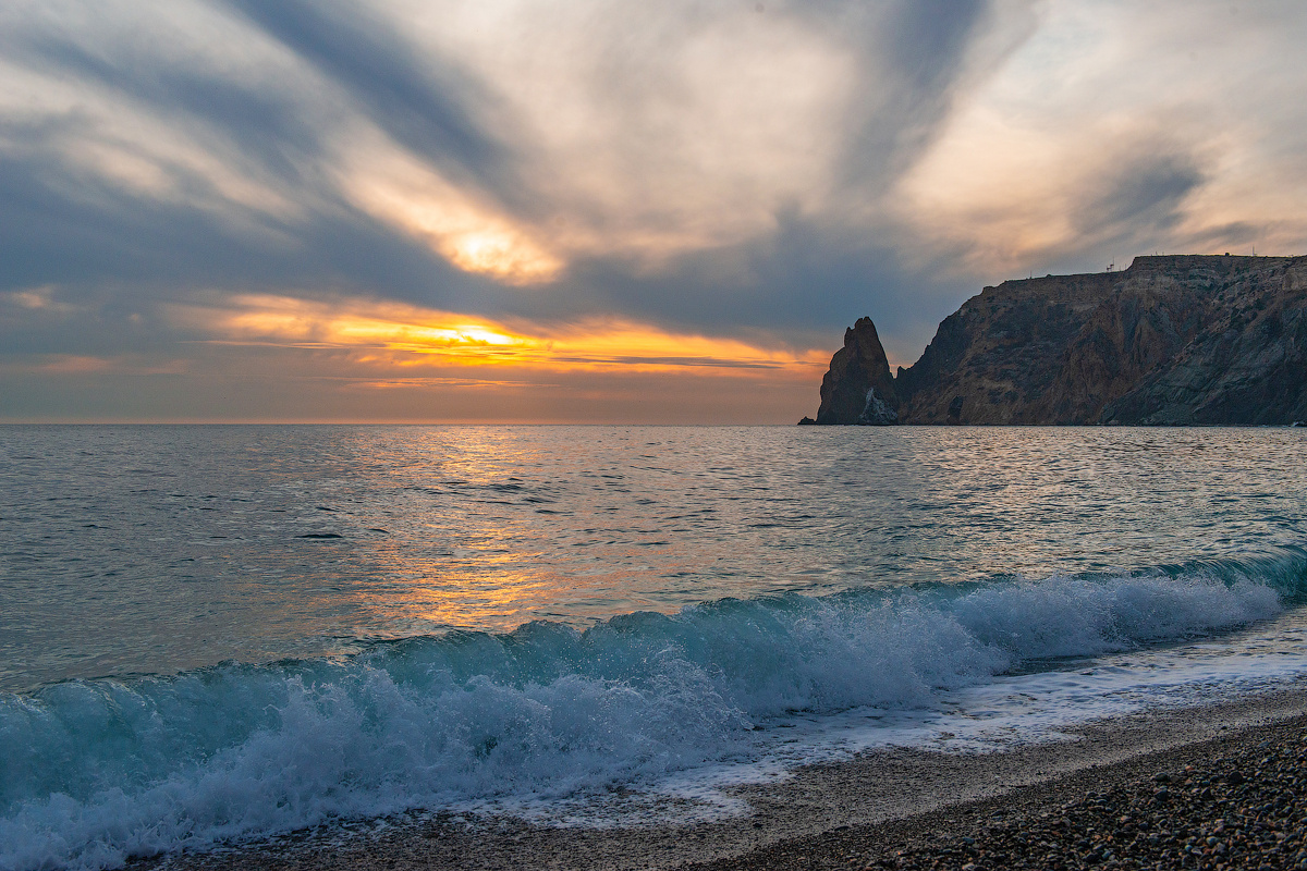 Пройти на вторую часть пляжа, в этот раз, нам не удалось. Море штормило и преграждало нам путь. Но, тем не менее, это не помешало нам полюбоваться восхитительным закатом и проводить день.