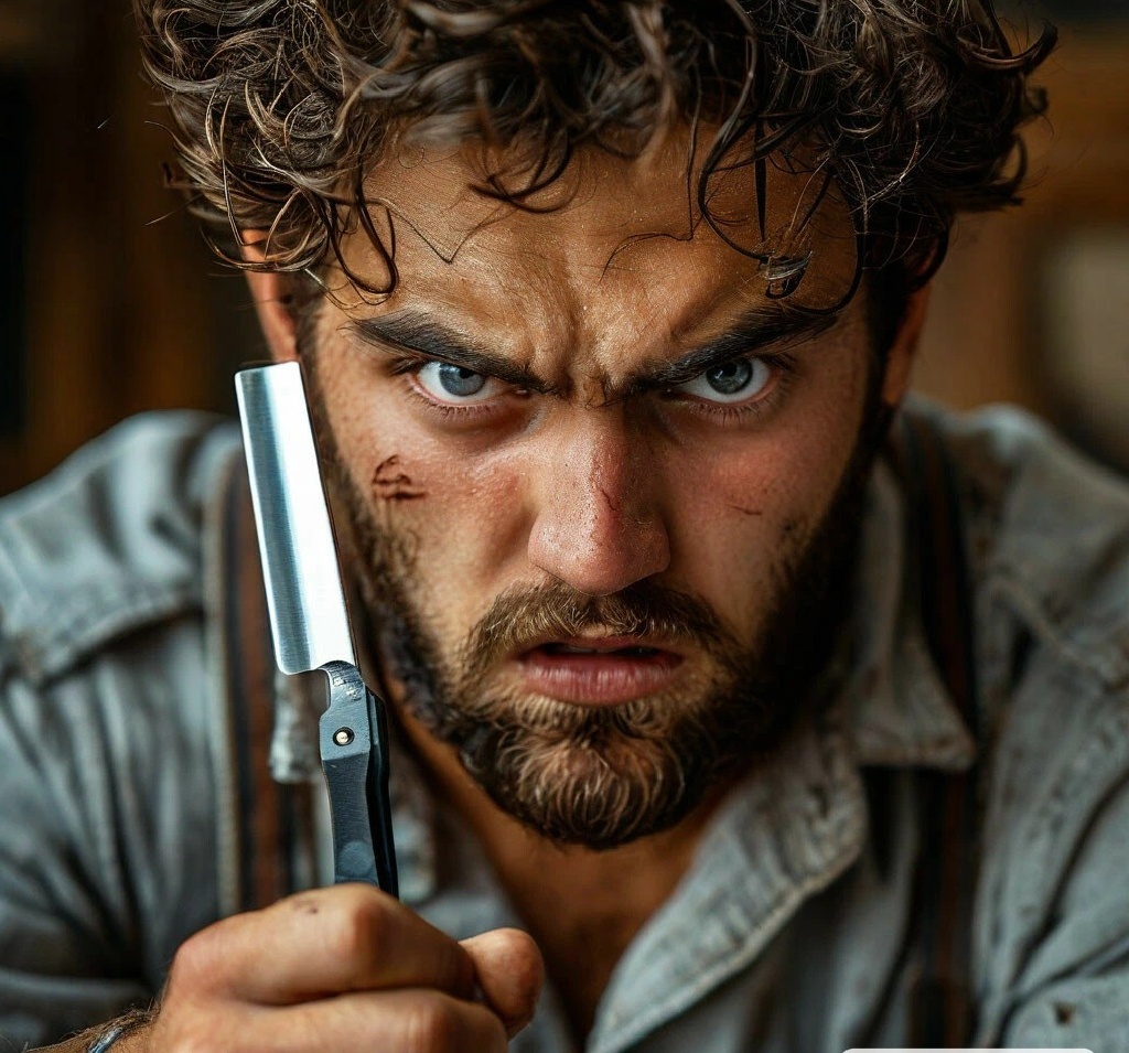 Одной рукой рванул на мне плащ, блузку, а другой - приложил к груди опасную бритву. После чего медленно поднял руку с бритвой к глазам.