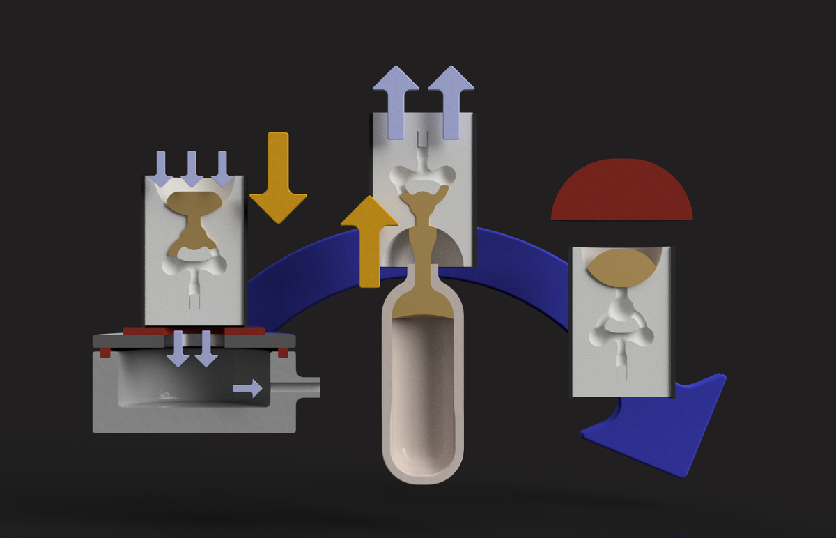 Фланец и силиконовая прокладка позволяет создать герметичное соединение между стаканом и опокой. Из за разницы давлений, атмосферного в верхней части опоки и внутри опоки и стакана, металл вдавливается атмосферным давлением внутрь формы, так же как и всасывается вакуумом внутрь формы. Отверстия в опоке позволяют быстрее откачивать воздух из формы, и быстрее создавать пониженное давление, как следствие с большей силой и скоростью всасывать металл в полости формы.