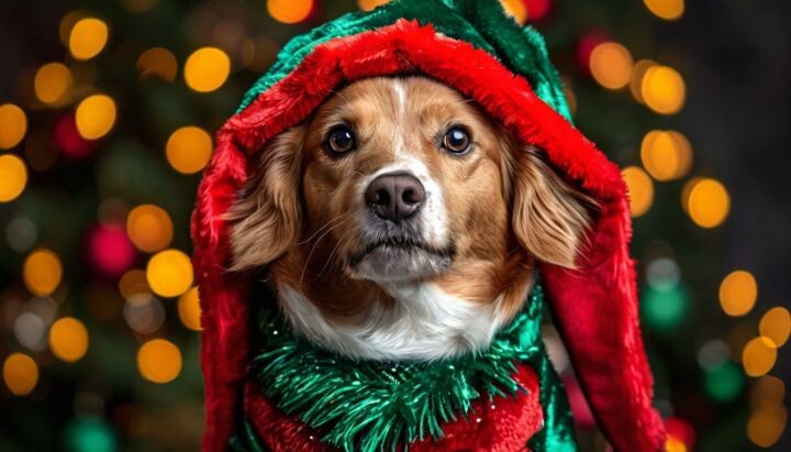 Пусть наши питомцы тоже блистают в праздники! Если хотите создать праздничный образ для себя и своих домашних животных, то присмотритесь к следующим идеям для пет-маскарада. Главное условие — чтобы ничего не мешало дружочку, не стесняло его движений, ведь он в первую очередь пёс, а не игрушка. На собак крупных пород можно надеть для забавного фото ободок с рожками оленя. В зоомагазинах можно найти такие обручи и для собак мелких пород. Вместо ошейника можно надеть такой «официальный» костюм. Но важно грамотно закрепить аксессуар: если он будет слишком свободным, то пёс может его потерять, а если застегнуть туго, то бабочка может душить питома. Наверняка у вас-то есть такой, а вот у собакена пока нет. А каким красавчиком будет ваш пёс на прогулке в таком наряде! Можно купить готовый или попробовать связать своими руками по индивидуальным параметрам. Готовьтесь, что прохожие захотят сфотографировать вашего питомца. Сейчас очень популярны такие для собачек мелких пород: костюм надевается