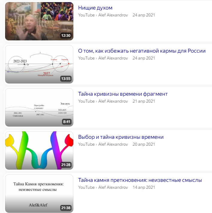 Авторские ролики, которые были размещены на ютуб, оказывается, можно найти на яндексе! Надо задать поиск Alef Alexandrov или ввести в командную строку https://ya.ru/video/search?channelId=d3d3LnlvdXR1YmUuY29tO1VDSmpXelUzZTBRbjVOeVZqcFFNaklsdw%3D%3D&how=tm&text=Alef+Alexandrov