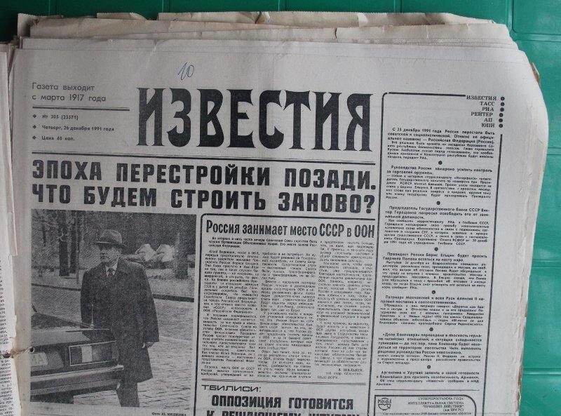 Собрал для вас первые полосы газет от 26 декабря 1991 года. В этот день рухнул Советский Союз. «ИЗВЕСТИЯ» Выходит с уставшим загом: «Эпоха перестройки позади. Что будем строить заново?» «ЗАРЯ» Теме посвящена не главная статья с загом: «Жить сообща, но в разных государствах». Главная тема в газете посвящена тяжелому труду телефонистки. «ЗНАМЯ» Говорит о коммунистах и вспоминает Ленина под загом «Начнём с нуля?»: «Запрет КПСС воспринят многими честными коммунистами с болью в сердце. И это понятно. Не могут они смириться с произволом, явным беззаконием, сиюминутными политическими соображениями власть предержащих и пытаются возродить партию в ленинском ее понимании». «ВЕСТИ» Курская газета пишет о либерализации цен. «АВАНГАРД» Рассказала о том, что депутаты проголосовали за суверенные республики в составе федерации. «ЗНАМЯ ПОБЕДЫ» Интересный (второй) заг в духе Коммерсанта: «Прихватизируют...».