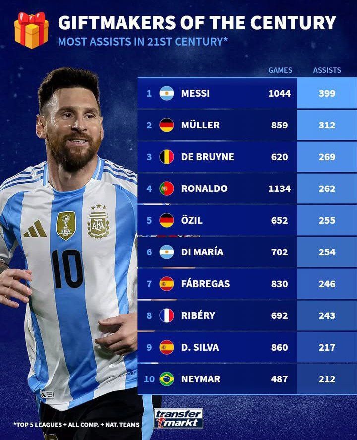 Главным футбольным Сантой XXI века стал Лионель Месси – аргентинец щедро одаривал партнеров ассистами. За сборную и европейские клубы Лео провел 1044 матча, в этих играх он отдал 399 голевых передач. Transfermarkt выделил десятку лучших ассистентов XXI века среди игроков, выступавших в топовых европейских чемпионатах. Первое место занял Месси, а на второй строчке расположился Томас Мюллер. Раумдойтер провел 859 матчей за «Баварию» и сборную Германии, немец отправил в свою копилку 312 голевых передач: на 185 матчей меньше Месси и на 87 ассистов меньше, чем отдал Лео. Кевин де Брюйне, занявший третью строчку, провел 620 игр, в которых отдал 269 голевых передач партнерам по клубам и сборной. Криштиану Роналду расположился на четвертом месте топа, у португальца невероятные 1134 матча в европейской карьере, в этих встречах он 262 раза помог забить товарищам по команде. Топ-10 лучших ассистентов Европы в XXI веке Топ-5 лиг + все турниры + сборные Чьи результаты вас удивили? 🤯 Ламин Ямаль от